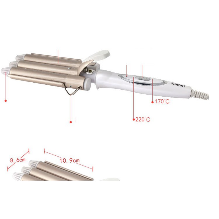 - Với máy uốn thông thường thì đối với 1 số người sử dụng khó khăn vì không biết uốn theo chiều nào hay kẹp vào bằng cách nào. Thì nay Máy Uốn Tóc 3 Trục Kemei - 1010 vô cùng dễ dàng cho việc tạo những những lọn tóc xoăn. Bạn chỉ cần chọn phần tóc mà mình muốn uốn dợn cho máy vào kẹp nhẹ nhàng từ đỉnh đầu đến đuôi tóc. - Máy được thiết kế với 3 trục giúp bạn tạo những kiểu tóc xoăn sóng nước hay lăn tăn ở phần đuôi sẽ 1 cách dễ dàng và nhanh chóng hơn là những kiểu đang được nhiều chị em ưa chuộng. - Mái tóc gợn sóng lăn tăn khiến bạn trẻ trung và dễ thương hơn nhiều lần so với mái tóc thẳng hoặc các kiểu tóc xoăn khác. - Dây điện mềm mại dễ cuốn gọn khi không sử dụng nữa được làm chất liệu an toàn khi sử dụng.Dây điện đuôi máy xoay 360 độ giúp không bị vướng víu khi tạo kiểu. - Có nút điều chỉnh nhiệt theo chất tóc và nhu cầu tạo kiểu phù hợp. - Bản kẹp phủ toàn bộ ceramic cao cấp chống hư tổn, khô xơ đuôi tóc.... - Là 1 sản phẩm không thể thiếu trong bộ sưu tập các loại máy làm tóc của chị em phụ nữ. Thông tin kyc thuật: - Tên sản phẩm: Máy Uốn Tóc 3 Trục Kemei - 1010 - Điều chỉnh mức nhiệt độ: từ 170 - 220 độ - Kích thước máy: 33.5cm - Kích thước bản kẹp: 11 x 9 cm - Chất liệu: nhựa ceramic và kim loại cao cấp. - Nguồn điện: 220V/50Hz - Bảo hành: 03 tháng lỗi kĩ thuật do nhà sản xuất