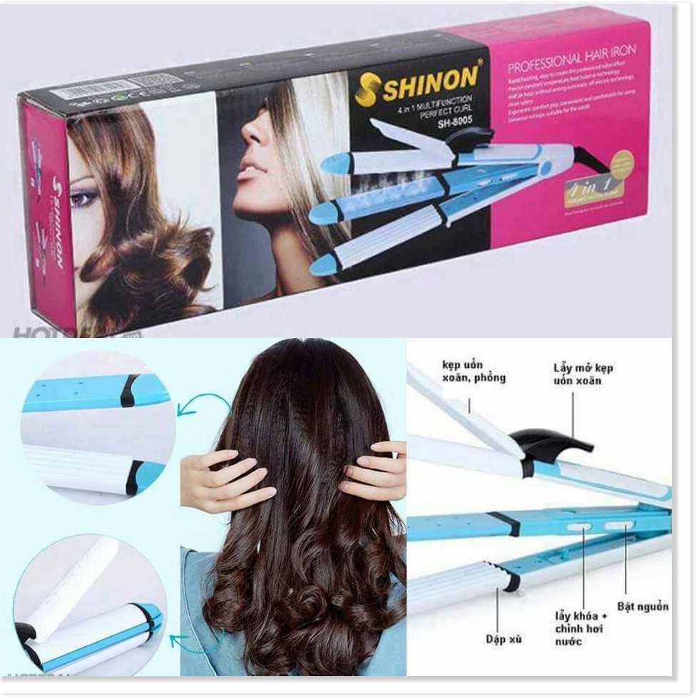 MÁY UỐN TÓC- DUỖI- BẤM 8005 ĐA NĂNG --------------------------------------- Máy uốn duỗi bấm ShinonSH-8005 Thích hợp uốn tóc lọn to cho tóc xoăn tự nhiên, dập xù theo từng cá tính của khách hàng, có thể duỗi thẳng đường kính ống là 26mm. Có chức năng phun hơi nước giữ ẩm cho tóc, giúp tóc tránh hư tổn khi tạo kiểu ở nhiệt độ cao, là chức năng mà không máy tạo kiểu tóc nào có hiện nay. Máy uốn duỗi bấm Shinon SH-8005 tạo kiểu tóc 4 trong 1 cao cấp là sản phẩm tiện dụng giúp phái đẹp tạo kiểu cho mái tóc thêm thẳng mượt, bồng bềnh và óng ả Máy uốn duỗi bấm Shinon SH-8005 tạo kiểu tóc 4 trong 1 là sản phẩm tiện dụng giúp phái đẹp tạo kiểu cho mái tóc thêm thẳng mượt, bồng bềnh và óng ả. --------------------------------------- Thông tin sản phẩm: - Kích thước: dài 26cm. - Chất liệu: nhựa + hợp kim. - Màu sắc: Trắng + đỏ. - Đế xoay 360 độ. - Nhiệt độ : 200 độ C. - Nguồn điện: AC 220V-240V, 50/60Hz, 35W-40W. - Trọng lượng: 429gr. --------------------------------------- #MAYUONDuOITOC #mayduoitoc