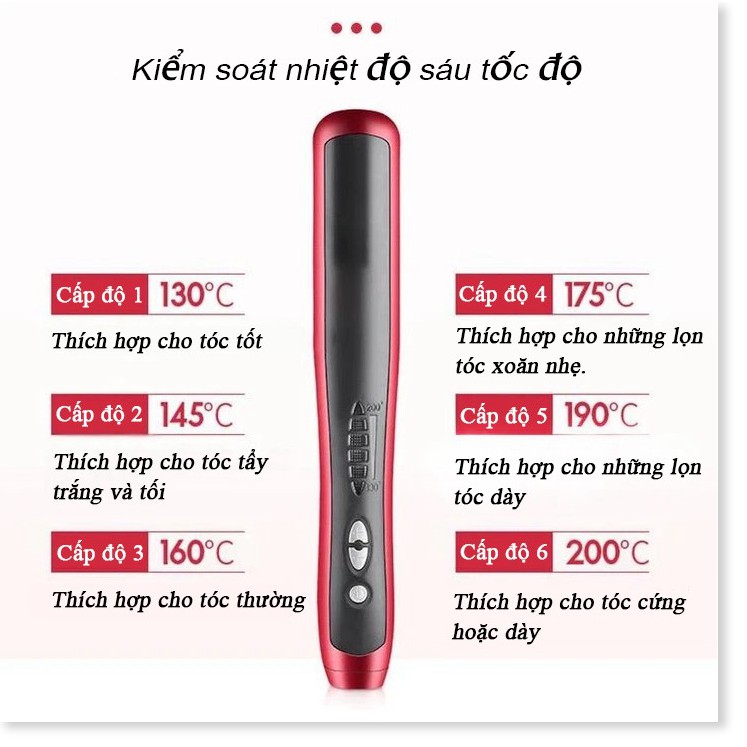 Máy Uốn Tóc 2 Trong 1 Anion Nano 6 cấp độ ĐẶC ĐIỂM NỔI BẬT : - (Tóc khỏe mạnh, suôn mượt) Máy duỗi tóc mang lại cho bạn trải nghiệm tuyệt vời, sẽ không hoàn toàn ép mái tóc của bạn, cũng sẽ không làm cho mái tóc của bạn trông nhạt nhẽo, vô vị. Mà dễ dàng giúp cho mái tóc của bạn chỉ cần duỗi một lần để mái tóc trở nên lộng lẫy và bóng mượt. - (Tiết kiệm thời gian, chống bị bỏng) Công nghệ làm nóng PTC 60 giây, làm nóng một phút bằng vật liệu làm nóng đặc biệt, tiết kiệm thời gian của bạn! Các yếu tố làm nóng giữa răng có thể ngăn ngừa bỏng da đầu,loại bỏ các vấn đề bỏng tay da đầu - ( 6 cấp và tự động tắt) Nhiệt độ 6 cấp dao động từ 265 đến 395 độ F, phù hợp với mọi loại tóc: mỏng, tẩy trắng, xoăn. Hiển thị LCD, dễ kiểm soát và theo dõi nhiệt độ, tự động tắt khi bạn quên tắt sau 1 giờ - ( Chăm sóc tóc với Anion) Bàn chải làm thẳng với anion nano bởi tấm sưởi tạo thành một lớp bảo vệ tóc, bảo vệ tóc của bạn khỏi khô và xoăn,giảm rụng tóc,giảm gãy rụng và phù hợp với mọi loại tóc - (Thích hợp mang đi du lịch) Kích thước nhỏ, tiết kiệm không gian khi đi du lịch. Cáp cuộn xoay 360 độ cho phép bạn cố định thiết bị ở mọi góc độ để có kết quả duỗi thẳng tốt nhất THÔNG TIN SẢN PHẨM : - Tên sản phẩm : Máy Uốn Tóc 2 Trong 1 - Chất liệu : hợp kim nhôm - Kích thước: 333 x 105 x 63mm - Thích hợp cho mọi loại tóc