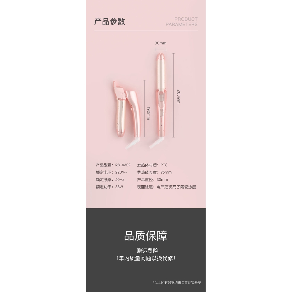 Product name: Riwa / RB-8309 Brand: Riwa / Model: RB-8309 Power: 25W (inclusive)-39W (inclusive) Power supply: plug-in Color classification: white pink Best modeling time: less than 1 minute Thermal conductor material: tourmaline ceramic Type: Two-in-one roll / straight hair Applicable hair: wet and dry Thermal conductor diameter: 21mm (inclusive) -30mm (inclusive)