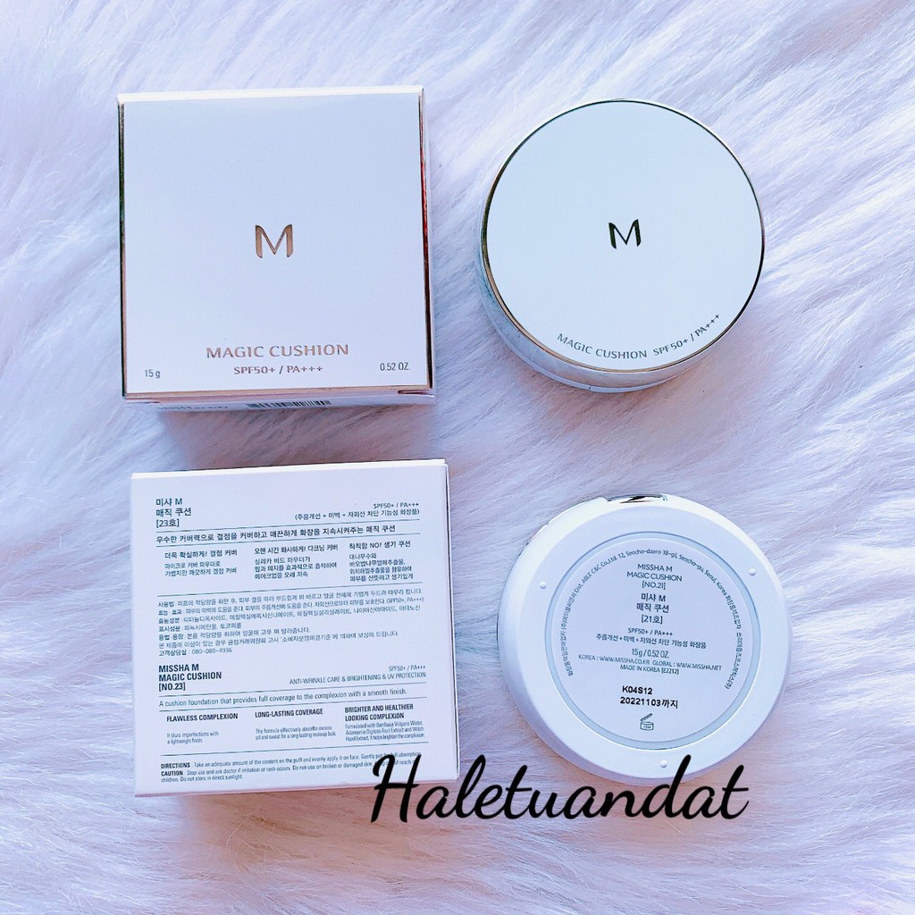 PHẤN NƯỚC MISSHA VELVET FINISH CUSHION SPF50+ PA+++ 15G Trào lưu trang điểm căng bóng đầy khỏe mạnh như các cô gái Hàn Quốc đang trở nên thịnh hành hơn bao giờ hết. Bắt kịp trào lưu với Phấn Nước Missha Velvet Finish Cushion ngay thôi nào. Để có ngay hiệu ứng làn da căng bóng đầy khỏe mạnh nha các cô gái. PHẤN NƯỚC MAGIC MISSHA CUSHION COVER LASTING Phấn nước với khả năng che phủ hoàn hảo, kết hợp 3 trong 1: kem chống nắng, kem nền, phấn phủ mang đến lớp trang điểm tự nhiên nhất cho các nàng rạng rỡ và xinh đẹp mỗi ngày. Phấn nước D&A Cover & Glow Dual Cushion 21-Light beige là một loại phấn nước mỏng mịn, dưỡng ẩm nhưng vẫn che phủ khuyết điểm tốt, mang lại một làn da hoàn hảo trong veo. Đặc biệt phù hợp với khí hậu nóng ẩm. Kết cấu mỏng nhẹ mang đến lớp nền có độ che phủ hoàn hảo và ẩm mượt. Phấn nước D&A Cover & Glow Dual Cushion 21-Light beige cho bạn một làn da sáng khỏe và căn tràn sức sống. Đặc điểm sản phẩm: - Trắng lên tone ngay lập tức - Vừa chống nắng SPF50+ PA+++, vừa dưỡng da lại có khả năng làm trắng. - Khả năng chống thấm nước cao. Chống lão hóa. Điều tiết nhờn - Che phủ vừa phải cho lớp kem mỏng nhẹ - Cho làn da mịn màng không bết dính - Thành phần kem tinh khiết được chiếc xuất từ các loài hoa, khi apply lên da lại rất nhẹ nhàng, có thể sử dụng cho bất kì độ tuổi nào của phụ nữ Việt Nam được nghiên cứu bởi nhóm chuyên da mỹ phẩm Hàn Quốc. Tuy chất kem mềm mại nhưng lại giữ tông màu rất lâu từ 8-12h trên da. Sau khi sử dụng bạn sẽ cảm nhận dược sự mềm mại và đàn hồi của làn da Sản phẩm được chiết xuất hoa hồng, hoa cẩm tú cầu, mẫu đơn, nghệ tây, hoa trà - Hạt dầu hoa trà: giúp giữ ẩm da, phục hồi da, kháng viêm, trị mụn - Hoa mẫu đơn: làm trắng da, chống oxy hoá, ngăn các bệnh lý về da, đây là một các làm đẹp cổ truyền của Trung Quốc - Hoa hồng: làm dịu da, se khít lỗ chân lông - Hoa nghệ tây HQ: có chứa nhiều vitamin E làm trắng da, thúc đẩy luuw thông mạch máu, ngăn ngừa lão hoá - Hoa anh túc Hàn Quốc: giữ nước trên da, chống viêm - Hoa cẩm tú cầu: làm dịu da Với vỏ hộp red gold sang chảnh cùng thiết kế 2 ngăn chưa từng có. - Ngăn 1: Concealing Base - Lõi ở phần nắp đậy, là kem lót có độ che phủ cao, dùng để che khuyết điểm như quầng thâm mắt, vùng da xỉn màu và nốt thâm. Vùng thâm mụn, nám, tàn nhang và lỗ chân lông to đều được giấu đi một cách tự nhiên. - Ngăn 2: Layering Cover Cushion - là phấn nước có chất kem lên da tương đối lì, kiềm dầu tốt. Chất kem sữa tươi giúp làn da đều màu và sáng hồng tự nhiên, mịn màng như sữa. Làm đầy vùng da bị lõm (như vùng mắt, khoé cười) tạo hiệu ứng glowy Hàn Quốc. Đồng thời cấp ẩm cho da, giúp da không bị khô khi trang điểm. #cushion #chephu #Missha #magic