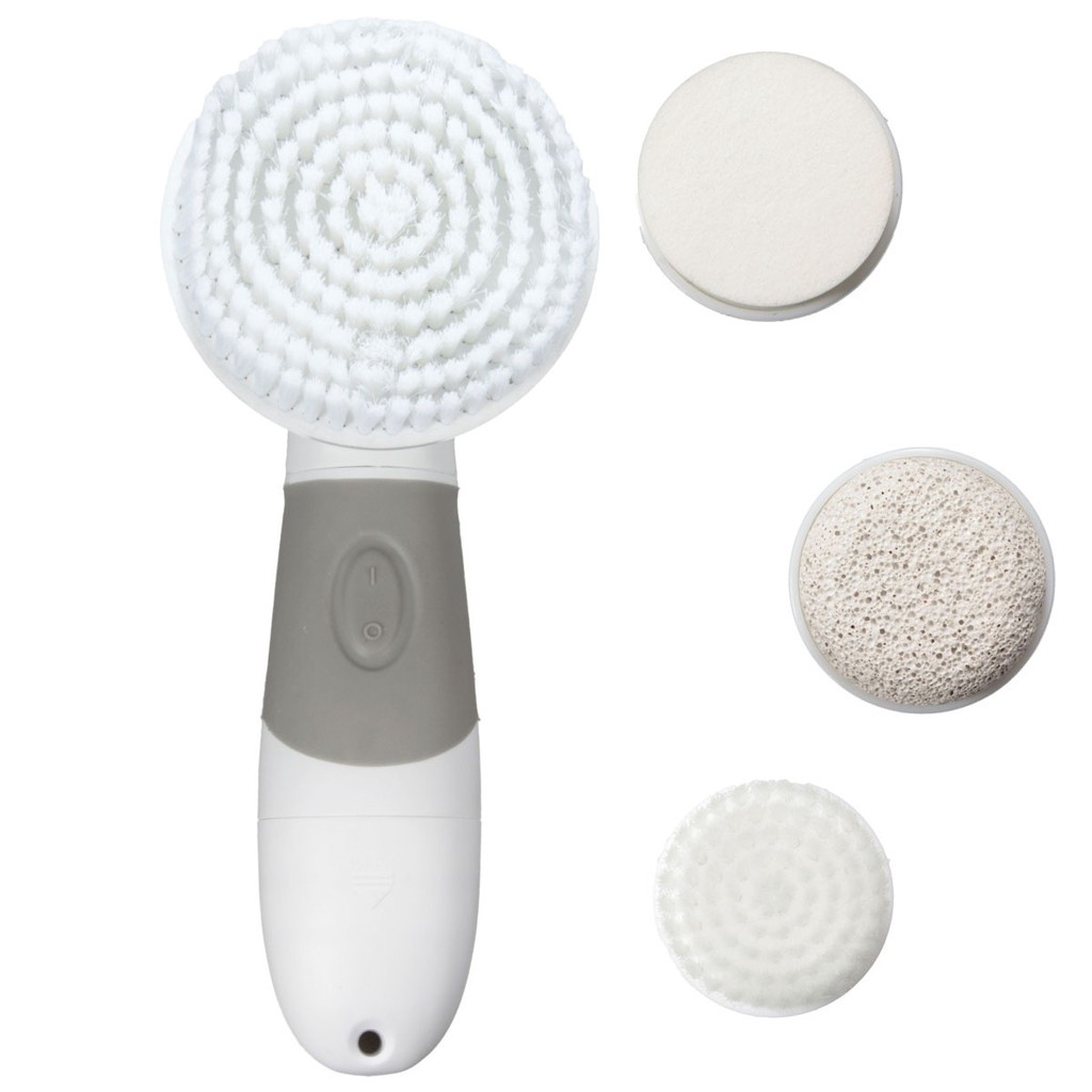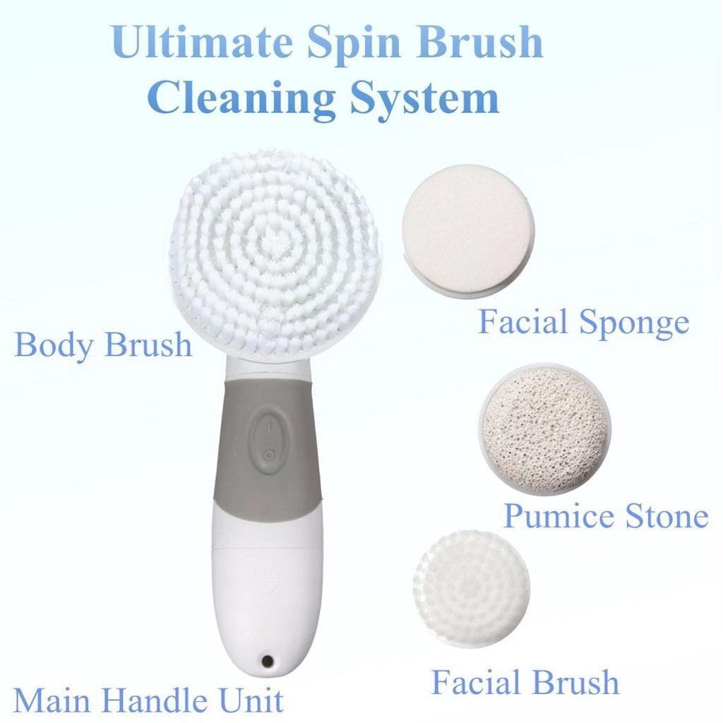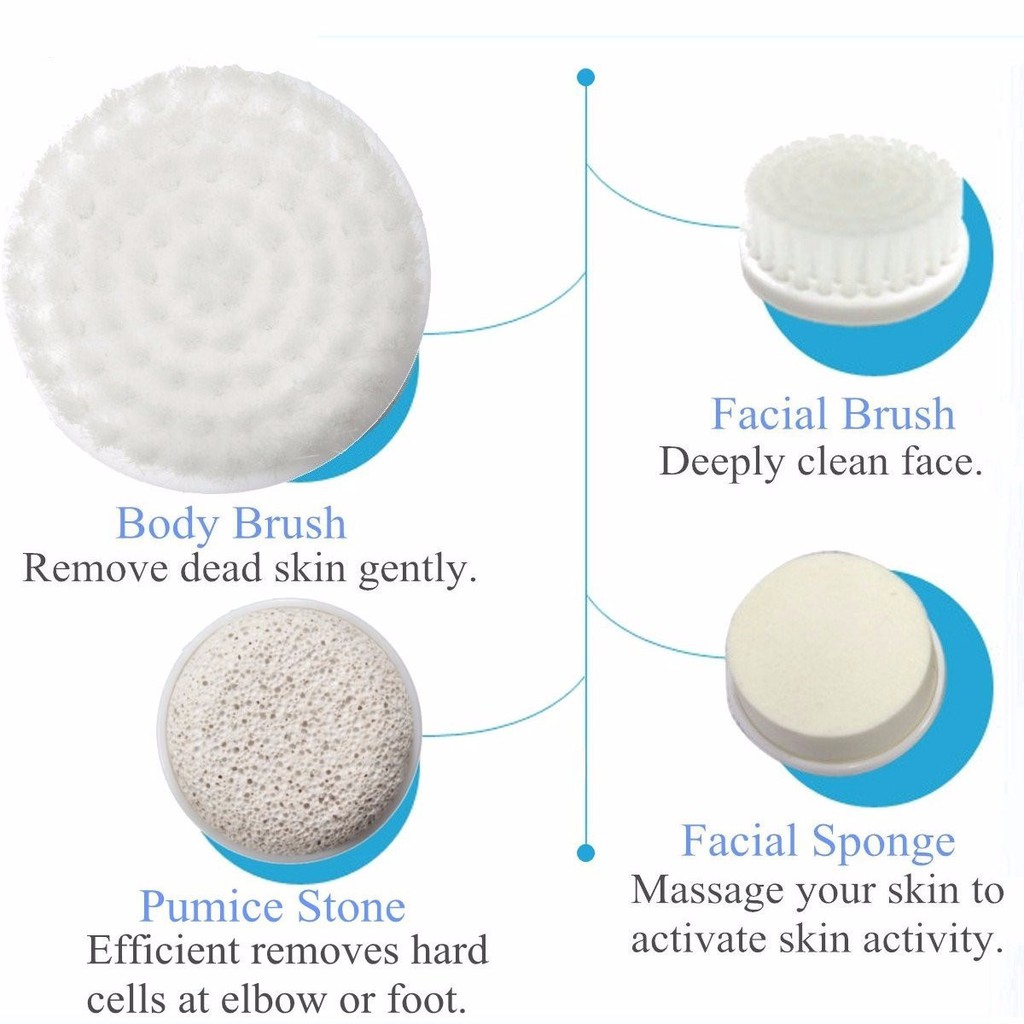 Features: 1.Clean body and face, & remove hard cells. 2.Rotating facial brush for deeply cleaning, effectively exfoliating of dead skin cells. 3.Reveal a radiant and youthful skin, stimulating blood circulation, eliminating fatigue and relieving pressure. 4.Enables you to reduce the appearance of fine line and wrinkles by deeply cleaning pores and extracting bacterial. 5.Suitable for the various parts of the body. 6.It is a waterproof item which is ideal for usage at bathroom. Specifications: -The Main Handle Unit: 1.Material:ABS 2.Power: 4pcs AA B atteries (Not Included.) 3.Waterproof: IPX5 4.Working Method: Rotary around 9000RPM 5.Speeds: One Speed 6.Color: White & Gray -Facial Brush: 1.Diameter:3.5cm 2.Apply to: Face 3.Function: Deeply clean face, and regular use it to get better result. -Facial Sponge: 1.Diameter:3.5cm 2.Applied to: Face 3.Function: Cosmetic soft sponge gently massage your skin to activate skin activity to make skin elastic and greatly helps nutrition absorption. -Big Body Brush: 1.Diameter:8cm 2.Applied to: Hand & Body 3.Function: Remove dead skin gently. -Pumice Stone: 1.Diameter: 3.5cm 2.Applied to: Foot & Elbow 3.Function: Efficient removes hard cells at elbow or foot while brushes spin them away. Package Included: 1x Main Handle Unit 1x Body Brush (Big Brush) 1x Facial Sponge 1x Facial Brush (Small Brush) 1x Pumice Stone 1x Manual
