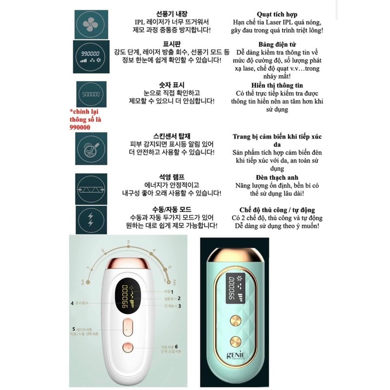 Mấy chị người toàn #VI_Ô_LÔNG chắc thích món này nè😁😁 ❌❌CẤP BÁO ❌❌, em về Máy Triệt Lông tại nhà Hàn Quốc- CÔNG SUÂT MẠNH NHƯ SPA - Có Màn Hình LCD luôn chuẩn xịn căng đét từng milimet đây ✅✅Máy triệt lông GENIE sử dụng công nghệ ánh sáng IPL, là công nghệ triệt lông vĩnh viễn bằng xung ánh sáng, được FDA Hoa Kỳ chứng nhận hiệu quả và an toàn! 👍👍 Máy có bước sóng 1100nm mạnh nhất trên thị trường, đây là chùm ánh sáng thâm nhập vào thông qua lớp biểu bì vào lớp hạ bì từ đó hấp thụ bởi melanin trong nang lông, sản xuất hiệu ứng nhiệt, và ánh sáng đó được hấp thụ và chuyển đổi thành nhiệt làm tổn hại đến nang lông vì thế mà có hiệu quả triệt lông không đau, rất an toàn nhất ⭕️⭕️⭕️ Ứng Dụng⭕️⭕️⭕️ - Loại bỏ hoàn toàn lông trên các vùng như : râu, nách, tay, chân, body... - Chức năng triệt lông hoàn toàn vĩnh viễn cho cả nam và nữ giới - Trẻ hóa da giúp da sáng bóng và mịn màng. Hiệu quả triệt lông là tốt nhất đối với những người da trắng – lông đen – dầy , hiệu quả rất kém với người da đen – lông mỏng – nhạt màu. 💖💖💖 8 liệu trình sử dụng cơ bản cho da thường như sau : - 4 liệu trình đầu : bắn xung khi lông mọc lại khoảng 2-3mm, tuỳ cơ địa mỗi người mà thời gian khi nào mọc lại sẽ khác nhau. - 4 liệu trình sau : thực hiện 2 tuần/1 lần. Em về số lượng ít do cuối năm hàng hoá khó khăn mấy chị tranh thủ, sỉ ib số lượng Made_in_korea --