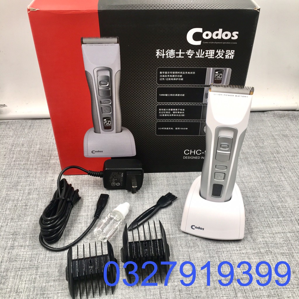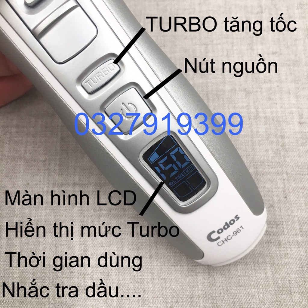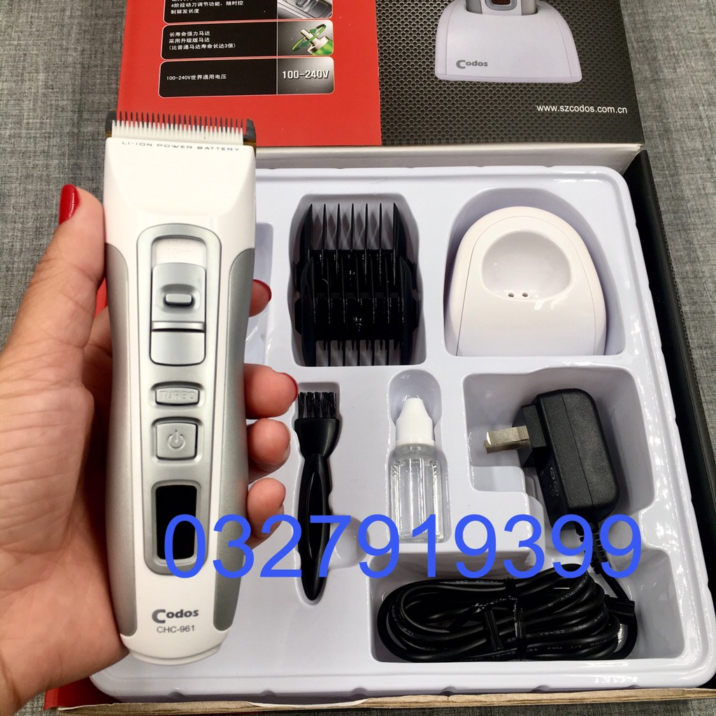 Giới thiệu Tông đơ cắt tóc cao cấp CODOS 961 Mô tả sản phẩm : - Tên sản phẩm : CODOS 961 - Màu sắc : xám + trắng. - Xuất xứ : chính hãng Nguồn điện : - 100~240V, 50~60Hz - 5V~1000mA - Pin sạc : Lithium Ion.Polymer 3.7v - Dung lượng pin: 2600mAh - Thời gian sạc : ~2 giờ - Thời gian sử dụng : ~ 150 phút liên tục - Trong số các thương hiệu nổi tiếng trong ngành dụng cụ làm tóc tông đơ cắt tóc thì CODOS là một thương hiệu được rất nhiều khách hàng tin tưởng và lựa chọn. - Với nhu cầu sử dụng ngày càng cao, salon hay tại nhà CODOS đều có thể đáp ứng được tất cả tất cả ngay cả khi bạn là khách hàng khó tính nhất Ưu điểm nổi bật : -Tông đơ cắt tóc cao cấp CODOS 961 kiểu dáng sang trọng, độ bền cao, máy chạy cực êm, lưỡi sứ sắc bén. - Máy có hệ thống tăng cường tốc độ TUBO nhanh hơn, khỏe hơn với 3 mức chọn tốc độ lưỡi. + Mức 1 : 5000 vòng/phút tường đương với thời gian dùng là ~150 phút liên tục + Mức 2 : 6000 vòng/phút tường đương với thời gian dùng là ~135 phút liên tục + Mức 3 : 7000 vòng/phút tường đương với thời gian dùng là ~120 phút liên tục - Nhanh nhất có thể lên đến 7000rmp (7000 vòng/phút) - Động cơ có bộ phận giảm ồn, máy chạy êm ái, ổn định. - Sử dụng pin đời mới nhất Lithium Ion, Polymer và có sạc cốc thuận tiện. - Lưỡi dao cắt bằng sứ tráng một lớp titann ( độ bền cao ). - Thiết kế tiên tiến với màn hình LCD : + Báo tốc độ lưỡi , thời gian dùng còn lại + Nếu pin sắp hết , trạng thái sạc sẽ nhấp nháy báo sạc máy + Nếu đã lâu bạn không thay dầu , chế độ dầu cũng sẽ nháy báo nhé . + Màn hình LCD còn báo trạng thái bạn đang sạc pin nữa - Công tắc thuận tiện cho cắt tóc bằng cả hai tay. Bộ Sản phẩm bao gồm : - 1 tông đơ CODOS 961 - 1 chổi vệ sinh - 1 lọ dầu tra - 1 cốc sạc - 1 dây sạc - 1 hộp đựng - 2 lược cữ gồm : 3~6 , 9~12mm - 1 sách hướng dẫn sử dụng. Thông tin thêm về sản phẩm Tông đơ cắt tóc CODOS 961: - CODOS là một thương hiệu cao cấp nổi tiếng , nên những dòng sản phẩm thuộc thương hiệu đều khiến bạn vô cùng an tâm chất chất lượng tuyệt vời sản phẩm . - Màu sắc rất tinh tế, phối màu hài hòa ăn khớp. - Công tắc thiết kế cũng có sự khác biệt với nút tắt bật tròn nhỏ vừa đầu ngón tay, sử dụng nhạy bén. Thông minh hơn cả là công tắc điều chỉnh hai lưỡi cắt được thiết kế di chuyển lên xuống với thanh di chuyển có gắn thêm chốt cố định, tránh tình trạng thanh di chuyển tự động. - Sản phẩm có bảo hành 03 tháng lỗi kĩ thuật ! - Liên hệ 0327919399 để được tư vấn ! - Shop CAM KẾT HÀNG CHUẨN NHƯ HÌNH , HÌNH SAO HÀNG VẬY . CHẤT LƯỢNG NHƯ MÔ TẢ . - Giao hàng toàn quốc #tôngđơ #tôngđơcắttóc #tôngđơgiárẻ #tôngđơcaocấp #tôngđơhớttóc #tôngđơđiện #tôngđơpin #tôngđơcodos #tôngđơcắttócchuyênnghiệp #tongdo #tongdocattoc #tongdophilps #tongdocaocap #tongdohottoc #tôngđơ #tôngđơcắttóc #tông #tôngđơhớttóc #tôngđơhớttócchobé #tôngđơcaocấp #tôngđơwahl #tôngđơđiện #tôngviền #tôngđơcạoviền #tôngđơchấnviền#tôngđơ #tôngđơcắttóc #tôngđơgiárẻ #tôngđơcaocấp #tôngđơhớttóc #tôngđơđiện #tôngđơpin #tôngđơcodos #tôngđơcắttócchuyênnghiệp #tongdo #tongdocatt