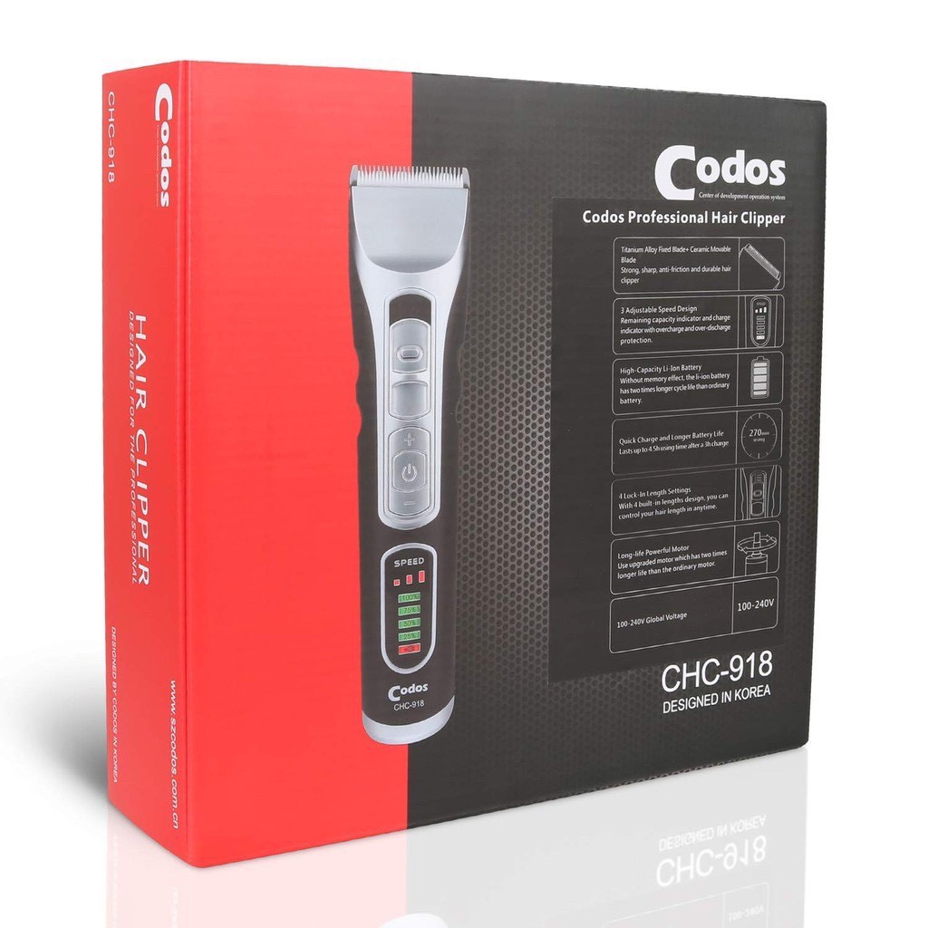 Tông đơ cắt tóc Codos Hàn Quốc, model CHC-918 + Thiết kế chuyên chuyên nghiệp cho solon tóc + Pin Li-on dung lượng cao + Dây sạc dài, có thể cắm điện trực tiếp để cắt, khi bị hết pin +++ Ưu điểm sản phẩm tông đơ Codos CHC-918 ✔️ Chuẩn hàng hiệu, tiếng máy êm ✔️ Lưỡi cắt cố định thép không gỉ phủ ti tan + Lưỡi thép di động Ceramic: sắc bén giúp giảm thiểu ma sát và bền bỉ ✔️ Pin li-on dung lượng cáo 2600 mAh, với 2 kiểu xạc (qua dock hoặc cắm trực tiếp) ✔️ Đông cơ mạnh mẽ 7W với độ dung và độ ồn thấp, được thiết kế với 3 cấp tốc độ, giúp thợ thuyên nghiệp làm việc lâu mà không bị mỏi ✔️ Với nhiều cữ tóc để điều chỉnh: Trên máy (1.0 / 1.3 / 1.6 / 1.9mm), và lắp ngoài ( 3/6/9/12 mm). ĐẶC BIỆC LƯỠI SỨ HỚT AN TOÀN CHO TRẺ EM Phụ kiện kèm theo: ✔️Tông đơ ✔️Củ sạc điện ✔️Dock sạc ✔️Cư lược răng: 3/6m và 9/12mm ✔️Dầu bôi trơn và chổi quét. shop cam kết Chỉ bán hàng Codos 100% - Bảo hành 12 tháng 1 đổi 1 (ko bảo hành linh kiện hao mòn như lưỡi căt và pin) - Hàng mơi 100%, đầy đủ phụ kiện theo thiết kế tiêu chuẩn của hãng - Sản phẩm 100% như hình ảnh mô tả Nhận ship nhanh trong 1 giờ đối với khu Vực TP HCM 0938260205 #tongdocattocchobe #tongdocattocgiadinh