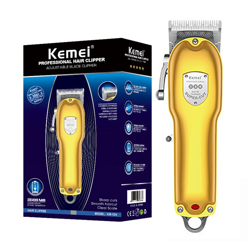 Tông Đơ Cắt Tóc Kemei KM-134 Kemei là thương hiệu khá nổi tiếng của trung quốc Mà hầu hết anh em thợ cắt tóc điều biết . năm 2020 Kemei cho ra đời chiếc tông đơ Kemei KM-134 Với thiết kế nguyên khối kim loại nắp được xi vàng rất đẹp mắt và sang trọng Tông Đơ Cắt Tóc Kemei KM-134 Được trang bị động cơ 8w đủ mạnh để cắt những loại tóc cứng nhất , và dung lượng pin : 2600mAh hoặt động liên túc hơn 2 giờ Tông Đơ Cắt Tóc Kemei KM-134 có thể nói là phiên bản hoàng chỉnh ít lỗi nhất từ trước đến nay của hãng kemei với giá chỉ vài trăm bạn đã có thể chiếc tông đơ Tông Đơ Cắt Tóc Thông số kỹ thuật Tông Đơ Cắt Tóc Kemei KM-134 Mô hình: KM-134 Điện Áp đầu vào: AC 100-240V 50Hz Công suất: 8W Thời gian sạc: 3 giờ, thời gian sử dụng: Khoảng 200-300 phút Kích thước sản phẩm: 19*4.5cm Trọng lượng máy: Khoảng 370g Cử : 3 -- 6 -- 9 -- 12mm Màu sắc: vàng Phụ Kiện Đi Kèp Theo Máy Tông Đơ Cắt Tóc Kemei KM-134 1 * Máy 1 * Cục Sạc 4 * Cử nhựa 1 * chổi phủi tông