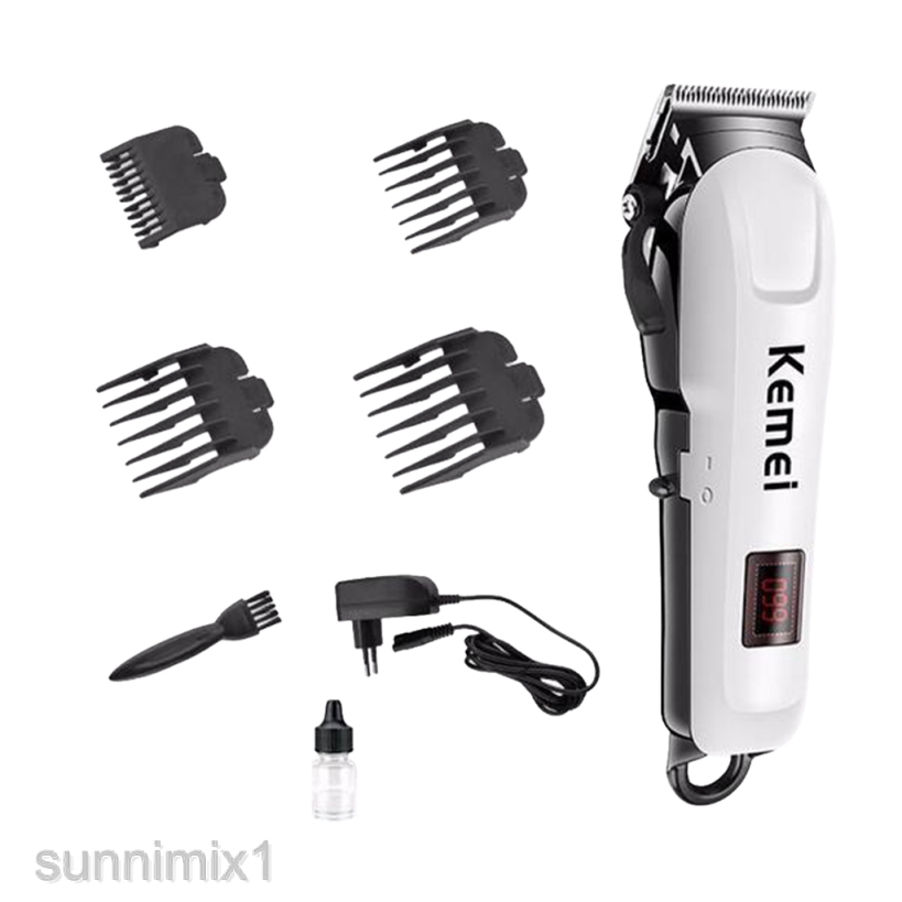 Description: Professional Barber tools, or use at home. LCD display, memory, battery recall, closed memories. Stainless steel blade, to avoid skin irritation, very hot, do not pull hair, blade width 45 mm. Low noise, high power. Ergonomic, sleek handle design, comfortable to hold and operate. Specification: Material: Metal Size: approx. 18.5 x 4.5cm Voltage: 110-240V Frequency: 50/60Hz Power: 12W Charging Time: 3 hours Using Time: 120 minutes Power Adapter: EU Plug Package Includes: 1 Piece Hair Clipper 1 Piece Power Adapter (EU Plug) 4 Pieces Limit Combs (3, 6, 10, 13mm) 1 Piece Cleaning Brush Note: Due to the hand measurement, there have size error about 1-5mm. Item color displayed in photos may be showing slightly different on your computer monitor since monitors are not calibrated same.