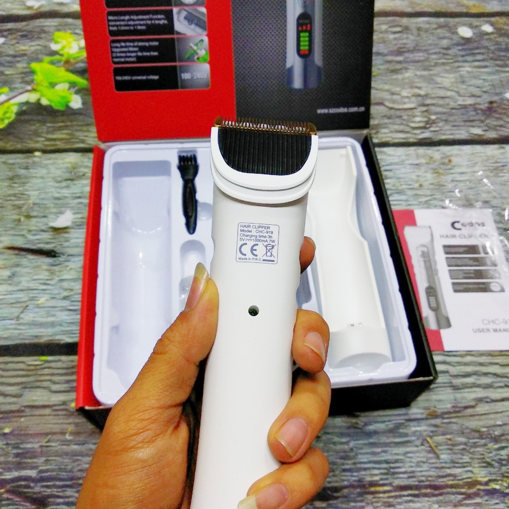 Tông đơ codos CHC-919. 918 kiểu dáng sang trọng, độ bền cao, máy chạy cực êm, lưỡi sứ sắc bén. - Máy có hệ thống điều chỉnh 3 tốc độ:5000 vòng, 6000 vòng, 7000 vòng. - Động cơ có bộ phận giảm ồn, máy chạy êm ái, ổn định. - Sử dụng pin đời mới nhất Lithium Ion, Polymer và có sạc cốc thuận tiện. - Lưỡi dao cắt bằng thép không gỉ tráng một lớp titan ( độ bền cao ). - Thiết kế tiên tiến với màn hình màu LCD báo tốc độ, thời lượng còn lại của pin. - Có thể dùng điện trực tiếp khi cần thiết : nguồn 2,4v nên rất an toàn. - Có lược căn độ dài tóc : 1 gá 3 - 6mm, 1 gá 9 - 12mm vừa có thể dùng có người lớn và trẻ em. - Công tắc thuận tiện cho cắt tóc bằng cả hai tay. - Sản phẩm còn có đầu thay và 1 chổi lông nhỏ giúp dễ dàng vệ sinh máy. Thông tin chi tiết về Tông đơ codos CHC-919: 1. Chất liệu: Sứ + Thép không gỉ tráng 1 lớp Titan + Nhựa ABS 2. Kích thước: 17.7*4.6*4Cm 3. Công suất: 7W 4. Nguồn điện: AC 100-240V/ 50-60Hz ; DC 3.5V /1000mmA 5. Pin sạc: Lithium Ion.Polymer 3.5V / 2600 mAh 6. Thời gian sạc pin: 3h 7. Thời gian sử dụng: 4.5h 8. Sử dụng: - Dùng để cắt tóc người lớn. - Trước khi sử dụng nên tra dầu bôi trơn vào đầu lưỡi thì khi cắt sẽ bén hơn và máy chạy êm hơn. Mỗi khi sử dụng xong cần vệ sinh tông đơ sạch sẽ và bảo quản nơi khô ráo. 9. Màu sắc: Trắng bạc, đen bạc 10. Đóng gói: - 01 Tông đơ CHC-919 - 01 Bộ sạc Adapter, dây sạc - 02 Lược căn chỉnh độ dài khi cắt: 1 lược 3mm - 6mm; 1 lược 9mm - 12mm - 01 Chổi lông vệ sinh máy - 01 Lọ dầu tra máy - 01 Pin theo máy - 01 Đế sạc máy 11. Trọng lượng: 750g 12. Mã sản phẩm: CHC-919