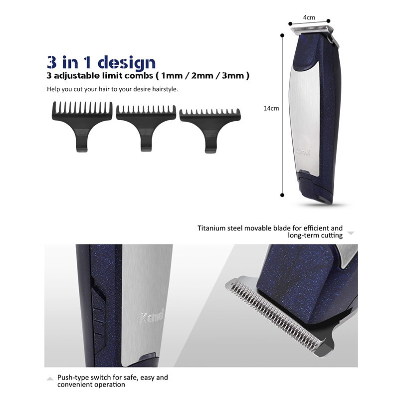 Mô tả KEMEI KM-5021 LÀ CHIẾC TÔNG ĐƠ DETAILER ĐANG RẤT ĐƯỢC ƯA CHUỘNG TẠI NHIỀU NƯỚC TRÊN THẾ GIỚI. tHIẾT KẾ NHỎ GỌN , THUẬN TIỆN , THƯỜNG NÊN THUẬN TIỆN MANG ĐI MỌI LÚC MỌI NƠI. LƯỠI DAO ĐƯỢC THIẾT KẾ KIỂU T-BLADE ( GIỐNG CHIẾC WAHL DETAILER CỦA MỸ) , LÀM BẰNG CHẤT LIỆU TITIANIUM CHO ĐỘ BỀN CAO VÀ CẮT SÁT HƠN. MÁY THIẾT KẾ RẤT NHỎ XINH, BẮT MẮT , ĐỘNG CƠ MẠNH MẼ , CÓ THỂ DÙNG CẮT TÓC, TẠO KIỂU , CẮT RÂU, TỈA RÂU, KẺ VIỀN PHÙ HỢP TIỆM TÓC CŨNG NHƯ NAM GIỚI THÍCH VIỆC TẠO KIỂU RÂU TÓC CHO BẢN THÂN Powered by: 600 mAh pin Lithium-ion Item Loại: tóc Clipper đa năng điện áp: 110-220V Power : 3 W Điện Áp đầu vào (V):3 v Thời Gian sạc: 8 giờ Thời Gian làm việc:60 phút trọng lượng bao bì: 450 GR Kích Thước sản phẩm (L x W x H): 4 X 4 X 14 CM . #tôngđơ , #tongdogiare , #kemei5021 , #sieure , #chatluong