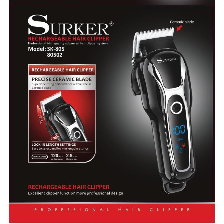 – Tông đơ dùng cắt tóc chuyên nghiệp. – Dung lượng pin 2000ah. – Có bản LED hiển thị dung lượng pin. – Tông đơ sử dụng pin sạc ( không dây). – Thời gian sạc 2.5 giờ sử dụng 125 phút. – Lưỡi nhựa. sứ cao cấp siêu bén. – Có 2 cấp độ mạnh . và đặc biệt bấm nút nguồn và giử 4g máy sẽ tự động khóa. Về loại sản phẩm không dây dùng pin sạc, hiện nay loại SURKER SK805 đang được khá nhiều người lựa chọn vì các ưu điểm của mình. Đầu tiên là cách sử dụng tông dùng pin thường khá đơn giản và dễ dàng. Trọng lượng của chúng khá nhẹ chưa tới 500Gram, kích rất nhỏ gọn, dễ cầm, chắc tay, bạn không lo mỏi tay hay vướng víu dây điện như khi dùng tông có dây. Một ưu điểm vượt trội không thể không nhắc tới của chiếc tông đơ là dù có công suất lớn song khi hoạt động lại vô cùng êm ái và nhẹ nhàng nhờ có công nghệ chống rung, chống ồn rất hiện đại.