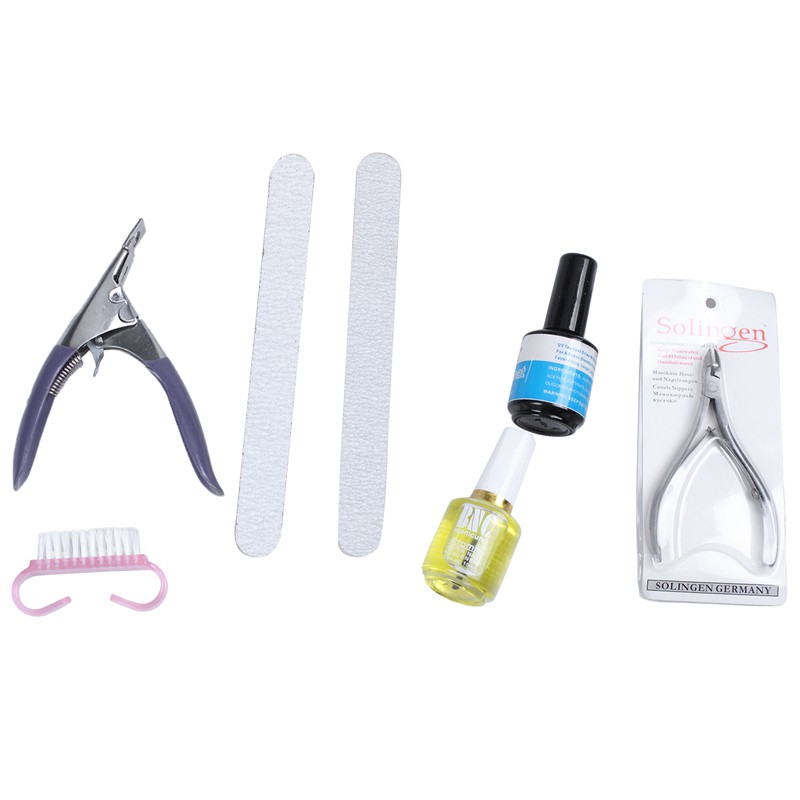 In the kit, it is a: 2 x 1/2 oz clear Gel, 1 x 1/2 oz white Gel, 1 x 1/2 oz pink Gel, 1 x 1/2 oz UV Top Coat, 2 x file, 20 x forms, 20 x white Capsules, 20 x transparent Capsules, 1 x oil, 1 x brush, 1 x er, 1 x clippers , 1 x cream, 1 x blade-, 1 x rope, 1 x scissors, 2 x separate-toes, 1 x block buffer, 2 x rhinestone and 15 x brush this product does not contain lamp This product does not contain instructions Color could will vary a bit in case under different lighting or on the screen of various powers separators NOTE: cleanser no more, no glue Material: Plastic Kit of manicure UV gel (cleanser no more, no glue) In the kit, it is a: 2 x 1/2 oz clear Gel 1 x 1/2 oz white Gel 1 x 1/2 oz pink Gel 1 x 1/2 oz UV Top Coat 2 x file 20 x forms 20 x white Capsules 20 x transparent Capsules 1 x oil, 1 x brush 1 x er 1 x clippers 1 x cream 1 x blade- 1 x rope 1 x scissors 2 x separate-toes 1 x block buffer 2 x rhinestone and 15 x brush Note:Light shooting and different displays may cause the color of the item in the picture a little different from the real thing. The measurement allowed error is +/- 1-3 cm.