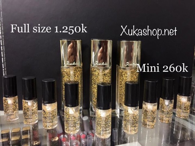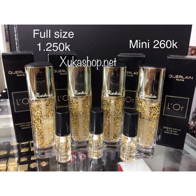 KEM LÓT VÀNG GURLAIN ✨Kem lót vàng 24k Guerlain L’Or Radiance Concentrate With Pure Gold có mùi hương hoa cỏ độc đáo và tinh tế. Hương thơm là sự pha trộn giữa các loại hoa hồng, mâm xôi và hoa nhài được nâng đỡ vững chắc bởi các chất tổng hợp balsamic, benzoin và xạ hương trắng. ✨Về chất kem, sản phẩm có kết cấu dạng gel trong suốt khá lỏng rất dễ tán và thẩm thấu nhanh vào da. Chỉ cần xịt một lượng vừa đủ lên mu bàn tay rồi dặm lên 5 vị trí cơ bản trên mặt, sau đó massage đều tay là các mảnh vàng sẽ phân rã kết hợp với lớp gel giàu ẩm thấm hút ngay vào da. Cảm nhận từ các reviewer cho biết, kem mang lại cảm giác mát lạnh thoải mái và nhẹ nhàng, làn da trở nên ẩm mượt ngay sau khi sử dụng. Lớp vàng 24k được phân tán đều nên bắt sáng rực rỡ, mang lại vẻ căng bóng, tươi sáng rất tự nhiên cho làn da mà không phải cảm giác bóng nhờn như các quý cô da dầu. ✨Giá full size: 1.250k ✨Giá mini: 260k