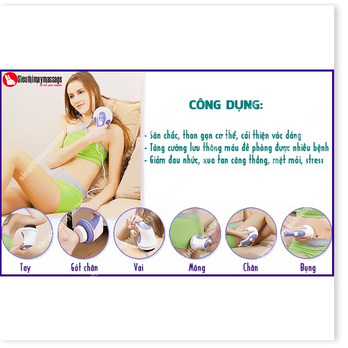 Mô tả chi tiết nổi bật của máy cầm tay massage Relax & Spin Tone: Trọng lượng của máy cầm tay Relax & Spin Tone nhẹ chỉ 1 kg cầm tay không gây mỏi khi dùng lâu. Kích thước cũng gọn nên không khó khăn khi cất giữ và mang theo. Relax & Spin Tone được làm bằng nhựa cao cấp cứng cáp chống rạn nứt, bền chắc lâu dài. Ngoài ra bề mặt máy còn được phủ lớp sơn xanh trắng sáng bóng màu sắc lâu bền tạo nên nét nổi bật cho sản phẩm. Máy massage cầm tay Relax & Spin Tone này rất dễ sử dụng, các bộ phận dễ tháo lắp, dễ điều chỉnh chức năng, thao tác rất dễ dàng. Relax & Spin Tone với các đầu massage chuyên dụng tác động sâu vào bên trong da và đem lại hiệu quả tối ưu nhất: Đầu nhám: dùng để chà gót chân loại bỏ đi các vết chai sần, giúp làn da thêm mịn màng đẹp hơn. Đầu gợn sóng: tất cả các vị trí trên cơ thể đều có thể sử dụng nhằm làm săn chắc. Đầu trơn: massage vùng cổ, vai, lưng điều trị và đề phòng các cơn đau nhức. Đầu bi lăn: các viên bi được thiết kế xoay chuyển động tác động vào các vùng bụng, đùi, eo, bắp chân, tay, đùi đánh tan đi lượng mỡ thừa. Đầu lưới: làm giảm đi căng thẳng, stress, lo lắng đem lại tinh thần thư thái, thoải mái hơn, giấc ngủ ngon và sâu. Relax & Spin Tone là loại máy cầm tay được thiết kế kiểu trục lệch tâm với góc 360 độ kết hợp tốc độ vòng quay lên đến 2500 vòng/phút làm giảm nhanh chóng các cơn đau nhức mãn tính, cấp tính, cải thiện sức khỏe, nâng cao tinh thần… Các nút điều chỉnh của máy massage cầm tay này rất thuận tiện cho bạn chọn chế độ thích hợp với nhu cầu sử dụng.