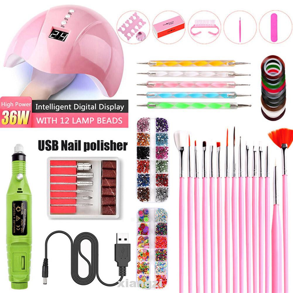 Description: This is a nail art kit, which includes 36W UV nail dryer lamp, manicure nail tools, stickers, gel polish, base coat and top coat. The nail dryer lamp is USB powered and it has 3 timer setting(60/90/120S), automatically infrared induction design. Provide you a complete nail art process from preparation. Top coat and base coat, protecting for your nails, no chipping or smudging, without harm to skin. Great for professional salon use and DIY home use. Specification: Name: nail art kit Type: 1, 2, 3, 4, 5(difference is of grinder's color) Grinder color: silver, blue, green, black, rose red Nail lamp specification: Color: pink Size(LxWxD): about 179x160x84mm Lamp bead: 12 LEDs Power: 36W Kit includes: 15 * color drawing pen 5* point drilling pen 10* gold and silver nail thread 2 boxes * nail decoration paste 1* polishing block 2* toe splitter 1* mini nail file 1* silicone push rod 1* nail claw brush 1*USB nail lamp 1*USB nail grinder Package included: 15 * color drawing pen 5* point drilling pen 10* gold and silver nail thread 2 boxes * nail decoration paste 1* polishing block 2* toe splitter 1* mini nail file 1* silicone push rod 1* nail claw brush 1*USB nail lamp 1*USB nail grinder Note: -Due to the light and screen difference, the item's color may be slightly different from the pictures. -Please allow 1-3cm differences due to manual measurement.