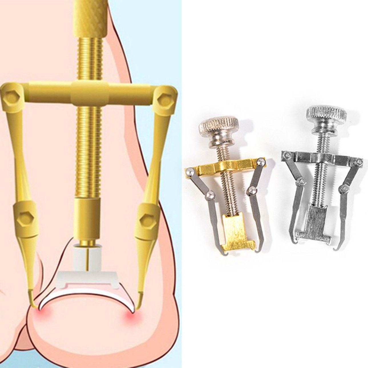 Ingrown Toe Nail Correction Tool Manicure Clipper Pedicure Fixer Recover Features: This product adopts lever mechanics to change the angle of nail growthIt is specially designed for curing ingrowing nails and paronychia and soon. Made by carbon steel, high hardness and intensity, no distortion. The angle of 2 hooks is specially suitable for the angle of toenails' growth, easier to reshape toenails. Simple but professional manicure tool, a great relief to ingrown toenails patients. Portable and mini size, available and convenient to carry it out when traveling or outdoors. Description: It is specially designed for curing ingrowing nails and paronychia and so on. Made of high-grade material, which makes it more durable, practical and healthy for you to use. Suitable for professional use as well as personal use. Specifications: Size: 40 * 25 mm Color: Gold, Silver Material: Carbon Steel Package included: 1 * Toe Nail Correction Tool How to use: 1.Use 35 degree hot water to Soak the foot about 20 mins 2.Hook both sides of the ingrown toenail with the two hooks on the equipment. 3.Use hand hold the middle fulcrum of the tool, twisting the nut to fix the equipment on the toenail with the other hand (fulcrum towards two directions for different sizes of the nails) 4.Slowly intensify, till there is a sense of expansion (no pain). (patients can soak your feet in warm water when take the correction ) 5.Intensify slightly for every 10 minutes. 6. After 30 minutes ,take the feet out of the water, wait for 15 minutes to dry feet. 7.Remove the equipment, the toenail is reshaped, position, stuff some medical cotton under the tilted nails to prevent rebound. Notes: 1.Due to the difference between different monitors,the picture may not reflect the actual color of the item. We guarantee the style is the same as shown in the pictures. 2.Due to the manual measurement and different measurement methods, please allow 1-3mm deviation. Thanks