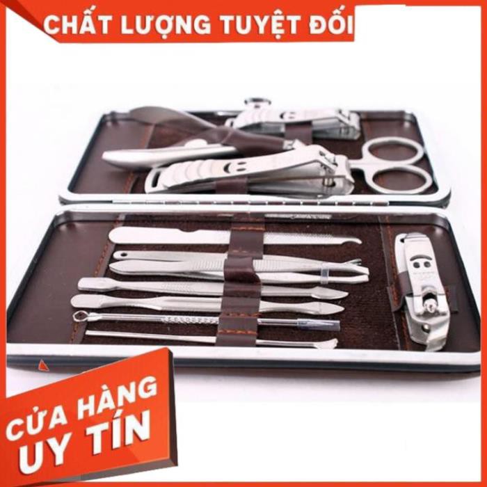 Chất liệu : Thép chống gỉ. Bộ sản phẩm gồm 12 món: 3 đồ bấm móng tay lớn + vừa + nhỏ, kéo cắt lông mũi, kềm cắt da, cây nặn mụn, 1 cây móc tai, 1 dũa, 1 nhíp, 2 cây lấy khóe, 1 dụng cụ làm sạch móng. Vỏ hộp chất liệu silimi sang trọng với nhiều màu sắc bắt mắt. Kích thước hộp giả da: 15.5 x 08cm Sản phẩm được đựng gọn gàng trong một chiếc hộp thật tiện dụng, dễ dàng bảo quản và mang đi bất cứ nơi đâu.