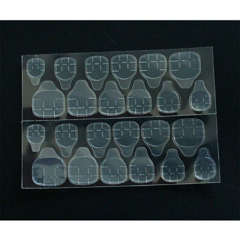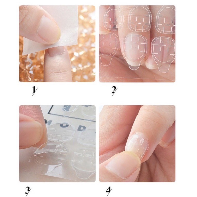 GIỚI THIỆU SẢN PHẨM : tấm dán móng tay giả Chất liệu: silicon 2 mặt Công dụng : dính móng siêu chắc Thích hợp cho loại da: mọi loại da Phân loại sản phẩm làm móng: tấm dán 2 mặt ------------------------------------------------------------------------ HƯỚNG DẪN SỬ DỤNG 1. Lau sạch bề mặt móng 2. Ướm thử móng giả sao cho vừa móng thật 3. Dán miếng dán silicon 2 mặt lên móng tay sau đó úp móng giả lên LƯU Ý: miếng dán không chống được nước. Gặp nước