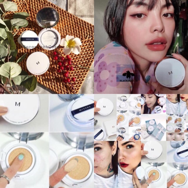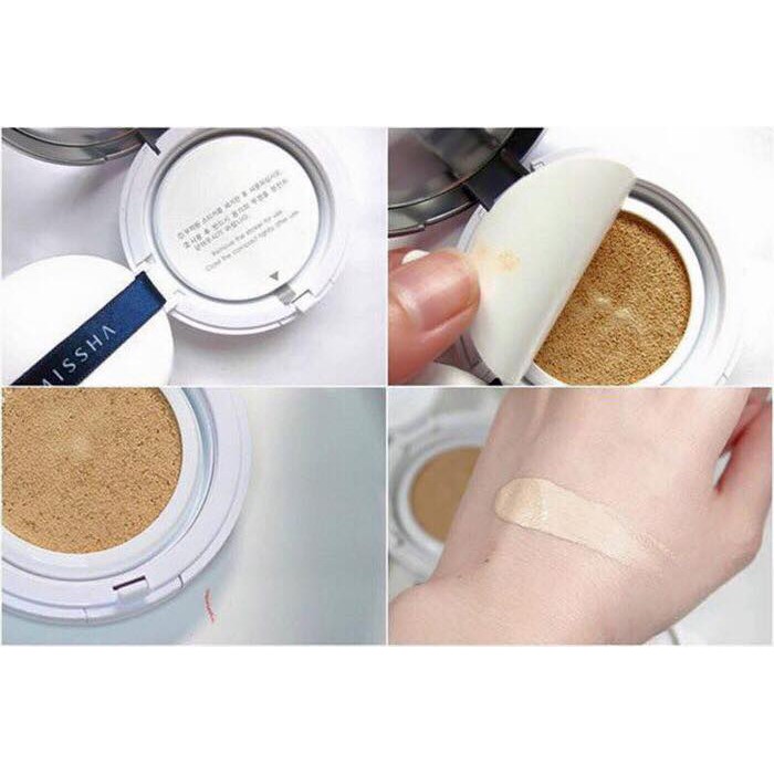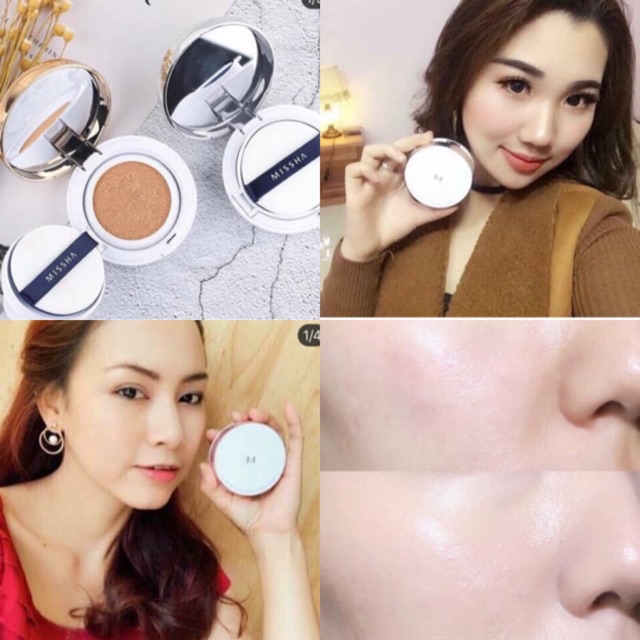 Kem nền dạng cushion (hay còn được gọi là phấn nước) là kem nền được chứa trong miếng nệm mút có kết cấu đặc biệt. Miếng nệm mút này được thiết kế với công nghệ bơm không khí. Bạn chỉ cần chạm nhẹ tay, lớp không khí mát sẽ tràn ra từ tấm nệm mút, mang theo những hạt bong bóng khí nhỏ chứa phấn và dưỡng chất lập tức làm dịu mát cho da. Cấu tạo của miếng nệm mút cũng giúp lấy ra một lượng kem mỏng, thật vừa phải, tạo nên lớp nền tự nhiên, mịn màng và thân thiện với da. Điểm đặc biệt nhất khiến phấn nước ngày các chiếm được cảm tình của các cô gái Việt Nam vì sau các lớp dưỡng da cơ bản như nước hoa hồng, sữa dưỡng và kem chống nắng (nếu có) chỉ cần duy nhất 1 bước trang điểm là cushion này thôi, không cần thêm phấn phủ. Với khí hậu nóng ẩm và mùa hè "cực hình" như ở Việt Nam thì đây là 1 ưu điểm quá lớn, khiến da bạn vừa "dễ thở" hơn lại tiết kiệm thời gian. Tất nhiên, nếu muốn giữ được lớp trang điểm lâu nhất thì bạn hoàn toàn có thể phủ thêm 1 lớp phấn thật mỏng tùy theo sở thích. Missha M Magic Cushion được đặt trong 1 vỏ hộp tròn, chất liệu nhựa viền kim loại. Thiết kế không quá sang trọng nhưng lại có vẻ đơn giản, dễ thương: - Phấn nước nền với khả năng che phủ hoàn hảo giúp che phủ tốt các khuyết điểm trên da. - Duy trì lớp trang điểm trong thời gian dài mà không xảy ra hiện tượng xuống tông khiến khuôn mặt bị tối. - Phấn tạo cảm giác da mướt, mượt mà không bị môc hay khô da. - Độ kiềm dầu tốt, phù hợp với cả bạn da dầu hay hỗn hợp dầu đến da thường. - Kết cấu kem mềm mỏng mịn giúp tăng khả năng bám trên da và không bị bết dính. - Thành phần chính: nước cây tre, chiết xuất cây baobap, nước cây phỉ nguyên chất giúp làm dịu da và cung cấp dưỡng chất cho da. - bổ sung nước khoáng và cây phỉ giúp se da, khít lỗ chân lông, tăng cường dưỡng ẩm. tạo nên một bề mặt make up mịn màng, bóng khoẻ và tự nhiên nhất. - Độ chống nắng cao, thích hợp dùng mùa hè. Tiết kiệm, dễ sử dụng. Dùng cho mọi loại da! Sản phẩm có 2 tone màu: #21- light beige (màu sáng), #23- natural beige (màu tự nhiên) #PHẤN #NƯỚC #MISSHA #1 #LÕI #M #MAGIC #CUSHION #50 #SẴN