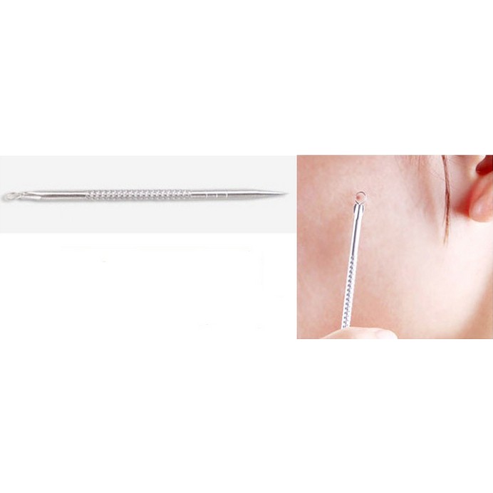 HƯỚNG DẪN SỬ DỤNG: Bước 1: chúng ta cần rửa mặt sạch bằng loại sữa rửa chúng ta hay dùng. Bước 2: làm lổ chân lông nở ra bằng cách xông hơi da mặt hay dùng khăn ấm để đắp lên mặt trong vài phút. Bước 3: vệ sinh cây nặn mụn bằng nước muối sinh lí hay chiếu tia cực tím, hay dùng cồn y tế, dùng giấy lau khô cây nặn mụn. Bước 4: chọn nốt mụn đã già ấn vừa phải, tránh ấn quá mạnh hay bị chệch là cho da bị tổn thương hay trầy xước dẫn đến tình trạng thâm, sẹo sau khi nặn mụn. Đối với phần hai bên cánh mũi, bạn nên để đầu nhọn của que nặn mụn theo hướng đi xuống. Với những đốm mụn ở trên mũi, bạn để đầu nhọn của que nặn mụn theo hướng chếch lên trên. Bước 5: sau khi đã đẩy cùi mụn ra ngoài bạn có thể dùng nước sát khuẩn được bán tại trung tâm da liễu để sát khuẩn và rửa mặt lại với sửa rửa, bạn có thể dùng thêm nước hoa hồng hoặc serum để các lổ chân lông được se khít tránh vi khuẩn vào bụi bẩn. Được thì các bạn hãy nặn mụn vào buổi tối, để tránh phần nào ánh nắng và bụi bẩn, sau khi nặn bạn bị sưng là chuyện bình thường chúng sẽ hết sau 1- 2 ngày, bạn thể kết hợp nghệ tươi để tránh thâm.
