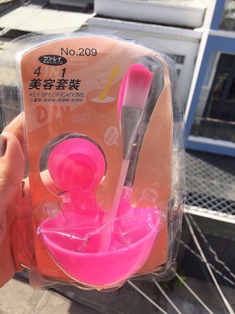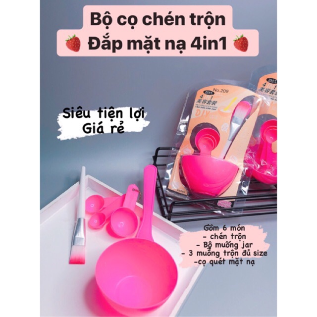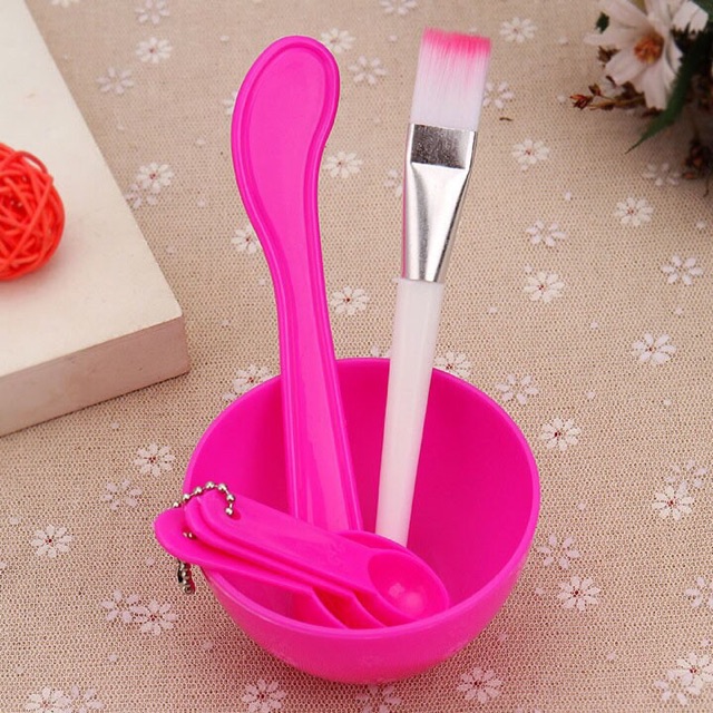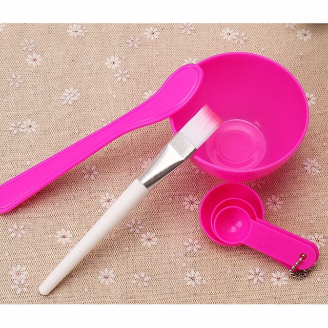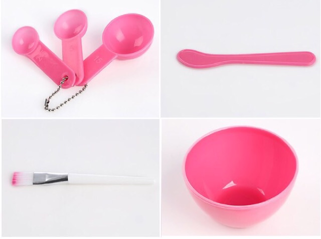 Bộ Dụng Cụ Trộn Mặt Nạ Đắp Mặt Beauty Mask 4 In 1 với thiết kế riêng để pha kem đắp mặt, sản phẩm có nhiều dụng cụ hỗ trợ người sử dụng như bát pha kem với dung tích 100ml, ba chiếc thìa, dao nhựa, chổi. ộ dụng cụ trộn mặt nạ đắp mặt cụ gồm: 1. Mask Bowl ( bát mặt nạ): bằng nhựa chất lượng cao, mềm, thiết kế dễ cầm trên tay., đường kính 8cm. 2. Mask Stick ( que trộn): bằng nhựa chất lượng cao. 3. Mask Brush ( bàn chải): bằng các sợi nilon mềm mại, thoải mái. 4. Bộ 3 muỗng với các kích thước khác nhau: 2,5g, 5g, 15g cho các nhu cầu khác nhau. Kích thước hộp sản phẩm : 20 x 12 x 8cm Bộ sản phẩm rất tiện cho những bạn muốn kết hợp giữa các loại mỹ phẩm Công dụng: ➖ Bộ dụng cụ giúp việc trộn và đắp các mặt nạ thiên nhiên trở nên dễ dàng, tiện dụng, sạch sẽ hơn. ➖ Đặc biệt các loại mask dạng lỏng (như mask tinh nghệ vàng-sữa tươi) thì dùng cọ quét sẽ nhanh gọn và sạch sẽ hơn so với việc phải loay hoay dùng ngón tay quét lên mặt đó ➖ Bộ trộn cực kỳ tiện lợi cho việc đắp mặt, nhỏ gọn và màu sắc xinh yêu nữa. ➖ Lưu ý: Sau khi dùng các bạn cần vệ sinh sạch sẽ lại sản phẩm