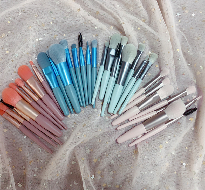 Description Product: Mini makeup brush Color: Apricot, pink, mint green,blue Suitable Skin Type: general Material: plastic handle + artificial fiber wool Specification Type: 8 brushes Weight: 28g The highly elastic Korean fiber hair does not irritate the skin and matches the strength of the hands to achieve excellent toughness for hand-to-heart brushing. The tip and wavy design has cushioning when contacting the skin, taking care of the dead corners of the face and filling the pores.