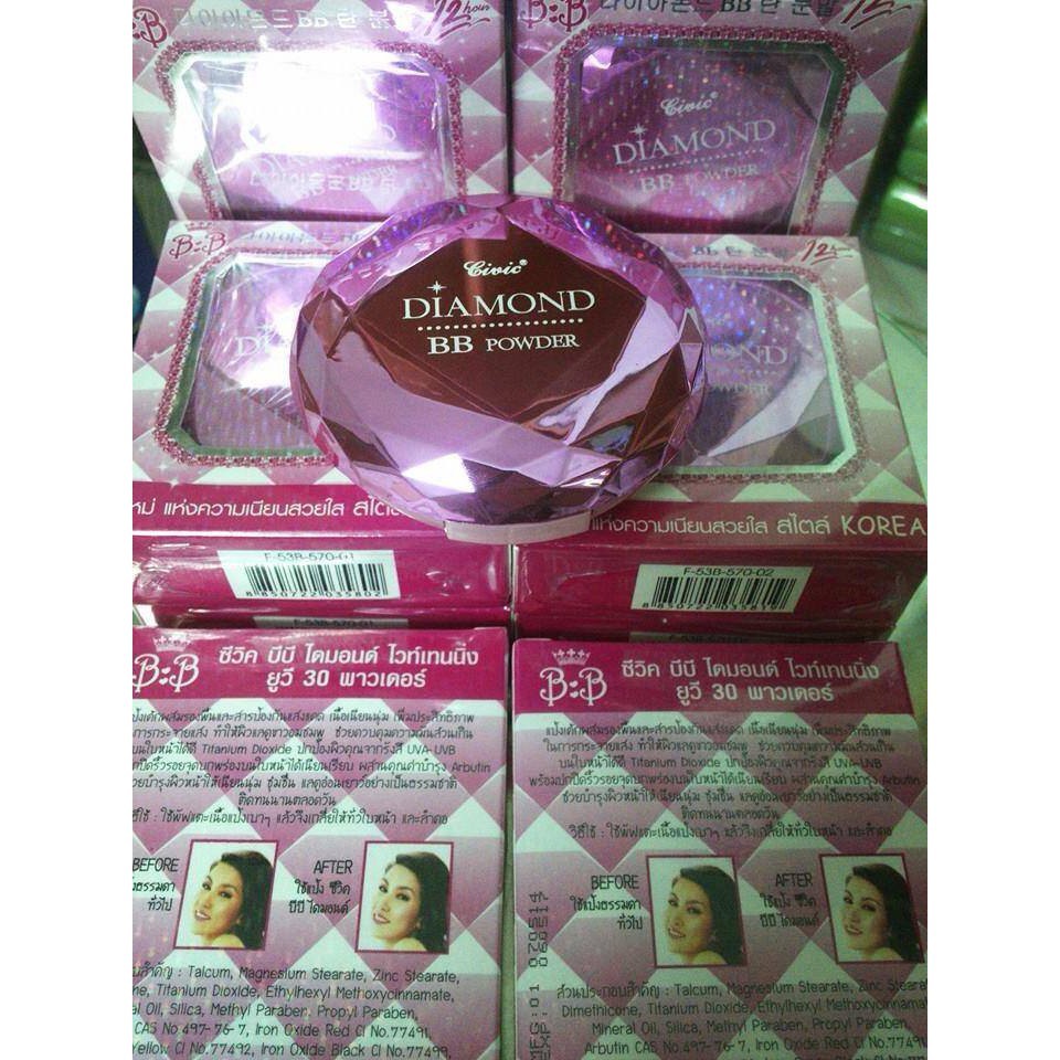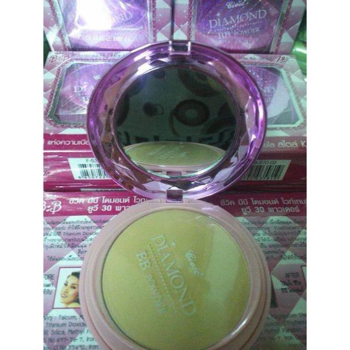 Phấn phủ Diamond BB Power không chỉ tác dụng như phấn nền thông thường, che dấu các khuyết điểm trên gương mặt và hạn chế sự tiết chất nhờn của da, cho bạn làn da mịn màng trắng sáng tự nhiên. Công dụng sản phẩm: - Phấn phủ BB Diamond Super Powder SPF 25 PA+++ thế hệ mới giúp làn da mịn màng trắng sáng tự nhiên - Là một sản phẩm của hãng Mistine với thành phần bột kim cương sẽ che dấu các khuyết điểm trên gương mặt và hạn chế sự tiết chất nhờn của da, cho bạn làn da mịn màng và trắng sáng tự nhiên. - Chất chống nắng có chỉ số SPF 25, phấn nền BB giúp ngăn chặn tia UVA là tác nhân làm đen sạm da