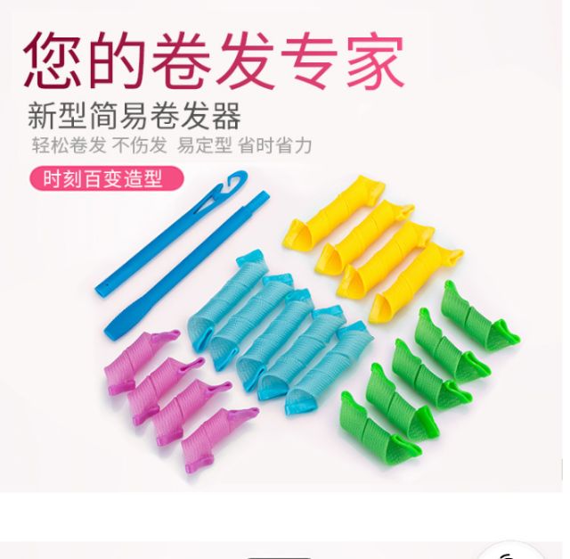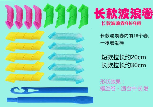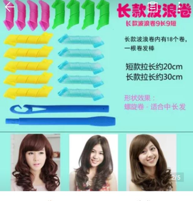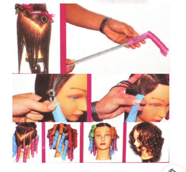 Sản phẩm làm xoăn tóc, thích hợp cho tất cả các bạn muốn có một mái tóc xoăn ở nhà mà không cần phải ra tiệm tóc, cách sử dụng rất đơn giản, bộ sản phẩm bao gồm một cây móc và 18 ống rút, 9 dài và 9 ngắn, bước đầu tiên các bạn xịt một lớp keo vào tóc, sau đó lấy dụng cụ rút tóc như trong ảnh, sau khi đã hoàn thành các bạn có thể lấy máy sấy nóng những cuộn ống này để giúp tóc xoăn nhanh chóng