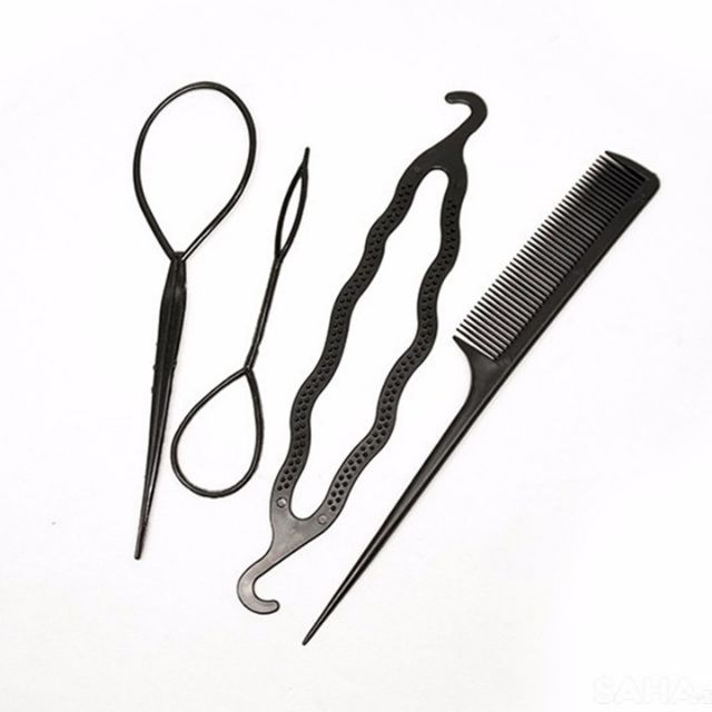 Bộ 4 món dụng cụ làm tóc đa năng Chất liệu: nhựa Màu sắc: đen Số lượng: 1 bộ gồm 4 món như hình: 2 cây rút tóc,1 cây cuốn, 1 cây lượt