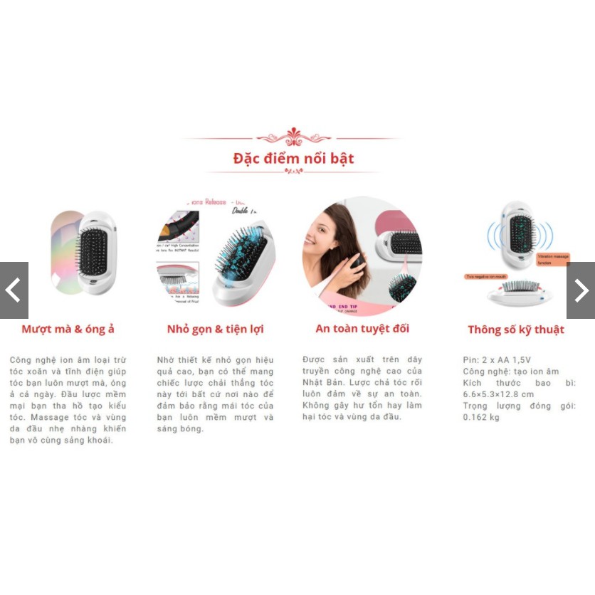 DỤNG CỤ CHẢI TÓC BEELINE PRO - CHỐNG LẠI HIỆN TƯỢNG TÓC RỐI VÀ TÓC TĨNH ĐIỆN TRONG MÙA ĐÔNG - LÀM MƯỢT MÀ VÀ ÓNG Ả TÓC NHANH CHÓNG - ĐẦU LƯỢC CHẢI MỀM MẠI MASSAGE CHO TÓC VÀ DA ĐẦU - THIẾT BỊ NHỎ GỌN VÀ TIỆN DỤNG, PHÙ HỢP VỚI MỌI LOẠI TÓC VÀ VÙNG DA ĐẦU ĐẶC ĐIỂM NỔI BẬT : Mượt mà & óng ả : Công nghệ ion âm loại trừ tóc xoăn và tĩnh điện giúp tóc bạn luôn mượt mà, óng ả cả ngày. Đầu lược mềm mại bạn tha hồ tạo kiểu tóc. Massage tóc và vùng da đầu nhẹ nhàng khiến bạn vô cùng sảng khoái. Nhỏ gọn & tiện lợi : Nhờ thiết kế nhỏ gọn hiệu quả cao, bạn có thể mang chiếc lược chải thẳng tóc này tới bất cứ nơi nào để đảm bảo rằng mái tóc của bạn luôn mềm mượt và sáng bóng. An toàn tuyệt đối : Được sản xuất trên dây truyền công nghệ cao của Nhật Bản. Lược chả tóc rối luôn đảm về sự an toàn. Không gây hư tổn hay làm hại tóc và vùng da đầu. THÔNG TIN KỸ THUẬT : - Pin: 2 x AA 1,5V - Công nghệ: tạo ion âm - Kích thước bao bì: 6.6×5.3×12.8 cm - Trọng lượng đóng gói: 0.162 kg