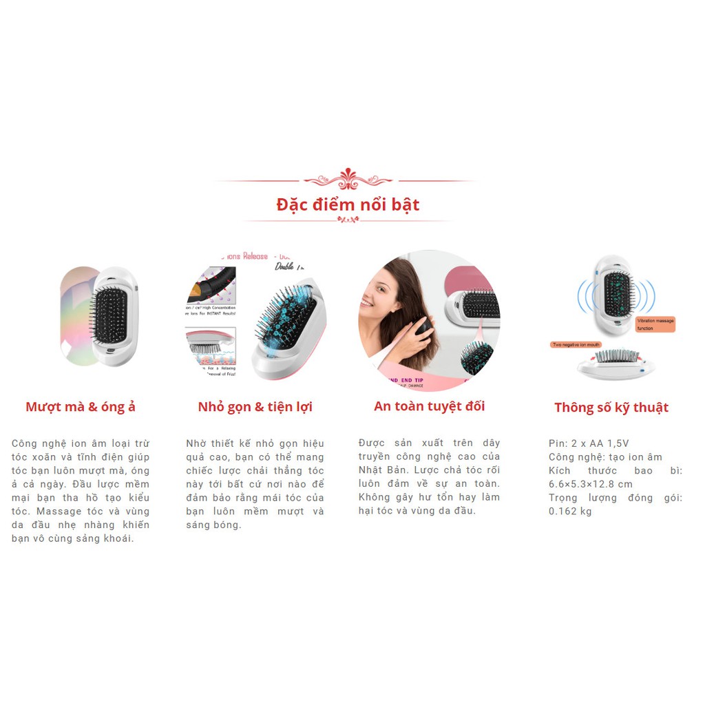 DỤNG CỤ CHẢI TÓC BEELINE PRO Hỗ trợ giao gấp trong ngày qua các dịch vụ Grab hoặc Ahamove , xuất hoá đơn VAT , SL nhiều cho các doanh nghiệp cần Liên hệ hỗ trợ qua zalo hoặc sdt 0898147714 mail : [email protected] - CHỐNG LẠI HIỆN TƯỢNG TÓC RỐI VÀ TÓC TĨNH ĐIỆN TRONG MÙA ĐÔNG - LÀM MƯỢT MÀ VÀ ÓNG Ả TÓC NHANH CHÓNG - ĐẦU LƯỢC CHẢI MỀM MẠI MASSAGE CHO TÓC VÀ DA ĐẦU - THIẾT BỊ NHỎ GỌN VÀ TIỆN DỤNG, PHÙ HỢP VỚI MỌI LOẠI TÓC VÀ VÙNG DA ĐẦU ĐẶC ĐIỂM NỔI BẬT : Mượt mà & óng ả : Công nghệ ion âm loại trừ tóc xoăn và tĩnh điện giúp tóc bạn luôn mượt mà, óng ả cả ngày. Đầu lược mềm mại bạn tha hồ tạo kiểu tóc. Massage tóc và vùng da đầu nhẹ nhàng khiến bạn vô cùng sảng khoái. Nhỏ gọn & tiện lợi : Nhờ thiết kế nhỏ gọn hiệu quả cao, bạn có thể mang chiếc lược chải thẳng tóc này tới bất cứ nơi nào để đảm bảo rằng mái tóc của bạn luôn mềm mượt và sáng bóng. An toàn tuyệt đối : Được sản xuất trên dây truyền công nghệ cao của Nhật Bản. Lược chả tóc rối luôn đảm về sự an toàn. Không gây hư tổn hay làm hại tóc và vùng da đầu. THÔNG TIN KỸ THUẬT : - Pin: 2 x AA 1,5V - Công nghệ: tạo ion âm - Kích thước bao bì: 6.6×5.3×12.8 cm - Trọng lượng đóng gói: 0.162 kg