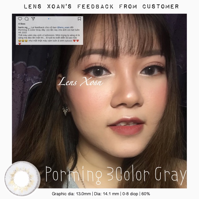 CÁC ĐỘ CÓ SẴN: 4,5(1)-5,5 ĐỘ Light Sexy Gray - xám tây thu hút, lung linh khi cần thiết:)))) ✨ Em Porming này có khá nhiều dòng nên mọi người cẩn thận ko nhầm nhá, em nó bao gồm 3 dòng: Porming Classic, Porming Cream và đây là Porming 3color( là tone sáng và nổi nhất trong 3 dòng của Porming nha ) ✨ Chính vì e nó khá nổi nên là phù hợp để đi chơi, đi chụp hay đi quẩy càng đẹp nhá hihi ✨ Màu lens là sự hoà trộn của 3 tone màu khác nhau nên khiến mắt sẽ sâu và hút hơn so với các mẫu lens 1 tone hay 2 tone ✨ Mặc dù là tone sáng nhưng k bắt buộc phải make kĩ hay ăn mặc nổi bật mà vẫn có thể diện e nó nhá. Các cậu có thể kéo xem fb có em khách mình chỉ đánh son thôi mặc áo dài đeo vẫn rất tây mà k hề bị giả nhá. #feedbacklensxoan #aptrong14 #olensgray #olensprenium #sexygraylensxoan #graylensxoan #porming3colorgray #porming3colorlens Áp tròng PORMING 3COLOR GRAY Giá : 350k/ đôi Đường kính: 14.1 mm Độ: 0-8 độ( cách 0.25 diop) Độ ẩm: 60% Hsd: 6 tháng Hãng: O-LENS from Korea Nhà sx: GEO MEDICAL Dòng: PRENIUM ------------------------------- ---ƯU ĐÃI KHI MUA COMBO--- Combo 1: Lens+ 1 Phụ kiện( ngâm/ nhỏ/ hộp đựng) = 390k Combo 2: Lens + 2 Phụ kiện( ngâm/nhỏ/ hộp đựng)=430k Combo 3: Lens+ 3 Phụ kiện (ngâm/nhỏ/hộp đựng)= 470k Combo 4: Mua 2 đôi tặng 1 hộp đựng/ngâm Combo 5: Mua 3 đôi tặng 1 nhỏ ------------------------------------