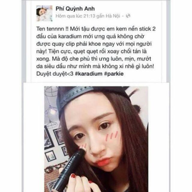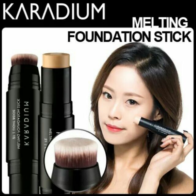 Kem nền dạng thỏi Karadium Melting Foundation Stick. Với các bạn gái năng động vừa thích make-up nhanh lẹ vừa thích sự tiện lợi thì em Kem nền dạng thỏi Karadium này là 1 sự lựa chọn cực kỳ hợp lý . Karadium có các nền như: Nền lọ, Nền tuýp, và Nền thỏi chính là sản phẩm mới đáng tự hào nhất của Karadium. Được cải tiến với kiểu dáng thon gọn, 1 đầu kèm chổi tán với sợi lông mềm mượt, giúp các nàng dễ dàng trong việc tán đều lớp nền trên mặt. Nếu như trước kia đi đâu, các bạn phải lỉnh kỉnh mang theo nền riêng, cọ riêng thì nay việc này đã trở nên vô cùng đơn giản. Sản phẩm vô cùng hiệu quả với thiết kế thông minh tiện lợi với sự kết hợp hoàn hảo giữ khả năng cover trọn vẹn của BB cream cùng độ mỏng mịn, và khả năng làm đều màu tuyệt đối của CC cream cho ra đời MELTING FODATION với các ưu điểm tuyệt đối cho bạn một sản phầm kem nền hoàn hảo. - Thiết kế 2 đầu với cọ tán cùng lõi stick siêu mềm với tinh chất essence CC và cover base của BB cream tạo ra một chất kem mềm , mỏng mịn, bền màu, hút dầu cực tốt với lõi khoáng trắng nằm ở giữa vừa giúp cân bằng sắc tố da vừa giúp làn da căng mịn. - Tinh chất essecce melting trong sản phẩm giúp lớp nền được láng mượt, loại bỏ hoàn toàn tình trạng mốc, bở khi makeup đồng thời cho làn căng láng mọng. - Thiết kế thông mình tiện lợi và hiệu quả tuyệt đối khi sử dụng với một đầu tick chỉ cần quét đầu stick balm lên da sau đó sử dụng đầu chổi lông tự nhiên có sẵn trên sản phẩm để tán đều như vậy là có đủ 1 lớp nền căng mọng hoàn hảo. Sản phẩm gồm 2 đầu linh hoạt: Một đầu là cọ tán siêu mịn; Một đầu 2 lớp nền: Lõi trắng là cover base &CC Cream Essence Anti-oily [hiệu chỉnh tone da +kiềm dầu, mồ hôi.