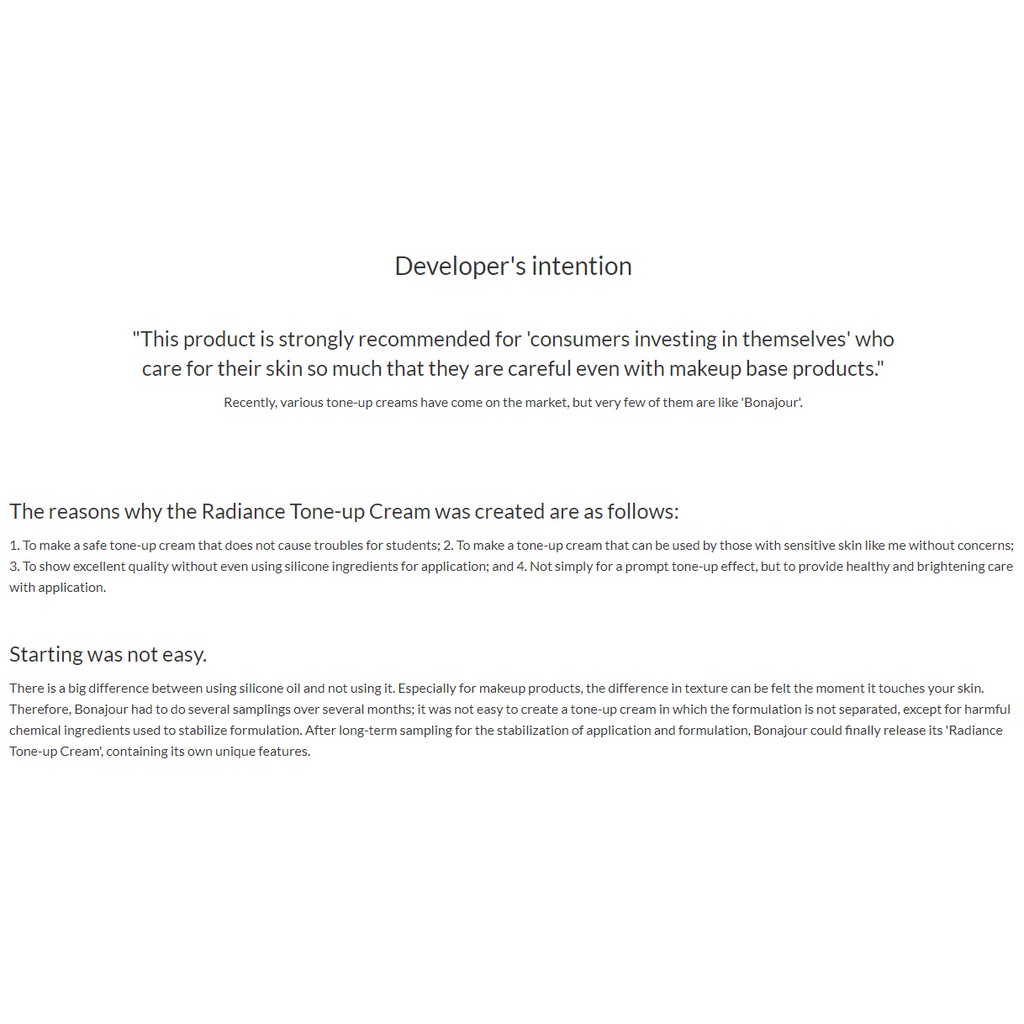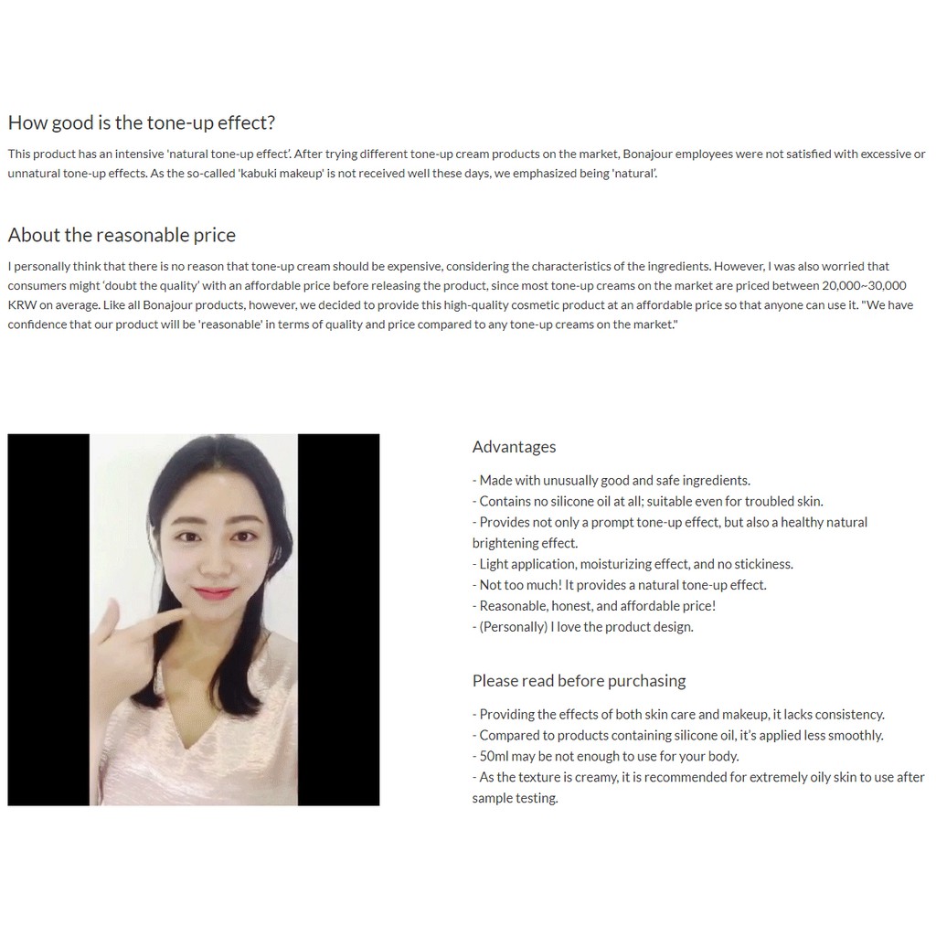 Bonajour Radiance Tone-Up Cream 50ml (Make-up Booster) It contains Mulberry root extract that is effective for whitening, soothing and moisturizing, as well as wild grass Western poison native in Canada. How to use After skin care, take a proper amount and evenly apply on parts that need to be toned-up. ingredient Water, Caprylic/Capric Triglyceride, Niaciamide, Glycerin, Butylene Glycol, Titanium Dioxide, Coco-Caprylate/Caprate, Vegetable Oil, Octyldodecanol, Cetearyl Alcohol, Cetearyl Olivate, Cetyl Palmitate, Propanediol, Sorbitan Olivate, Sorbitan A Palmitate, Leoj Bulb Extract, Leojum A Palmitate, Leoj Bulb Eugenia Caryophyllus (Clove) Bud Extract, Sodium Hyaluronate, 1,2-Hexanediol, Pentylene Glycol, Zizania Aquatica Extract, Carthamus Tinctorius (Safflower) Bud Extract, Sorbitan Oleate, Glutathione, Madecassoside, Acrylates/C10-30 Alkylexrylate Crosspolymer, Ethylhexylglypolymer, Eugenia Polyhydroxystearic Acid, Arginine, Caprylhydroxamic Acid, Alumina, Triethoxycaprylylsilane product information Brand: Bonajour Net weight: 50ml Made in Korea