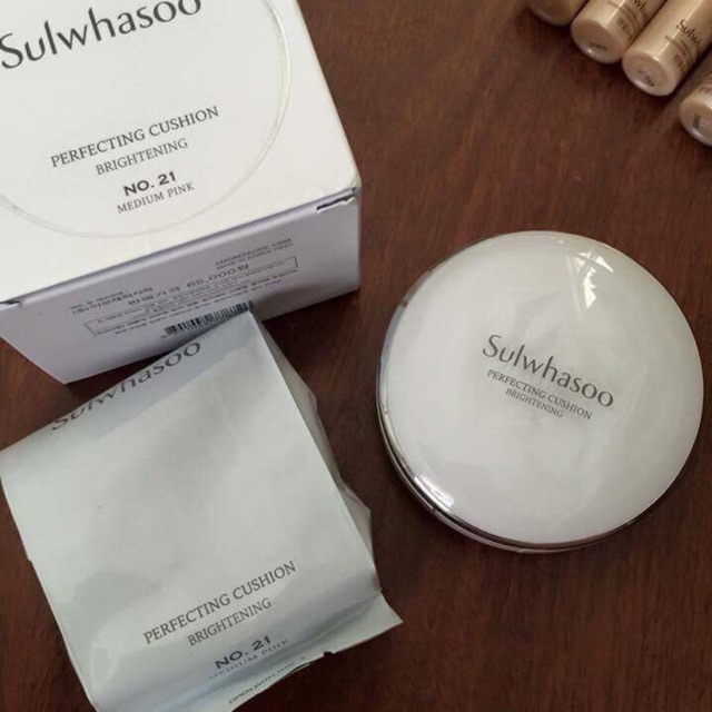Sulwhasoo perfecting cushion brighting - Phấn nền dưỡng trắng, làm sáng da cho làn da mịn màng, toả sáng trong suốt. Lớp kem nền biến đổi làn da bằng cách trực tiếp làm sáng màu da. Công thức chế biến bao gồm chiết xuất hoa mộc lan, chỉ nở dưới ánh sáng rực rỡ của mùa xuân, và công nghệ PC để đem đến một ánh hào quang trong suốt cho làn da của bạn. Trong suốt 12 tiếng sau đó làn da được đảm bảo sử rực rỡ tự nhiên. Làm sáng và lọc lại những khiếm khuyết. Sulwhasoo chỉ sử dụng loại nước tinh khiết nhất cùng với chiết xuất cam thảo để dưỡng ẩm cho da và tạo độ sáng nhiều giờ sau đó. Biến đổi làn da trở nên mượt mà và sáng hơn với công nghệ hút dầu, loại mỹ phẩm này kiểm soát dầu thoát ra trên da và để lại một bề mượt bóng mượt hoàn hảo. Gồm: Hộp chính 15g + lõi refill