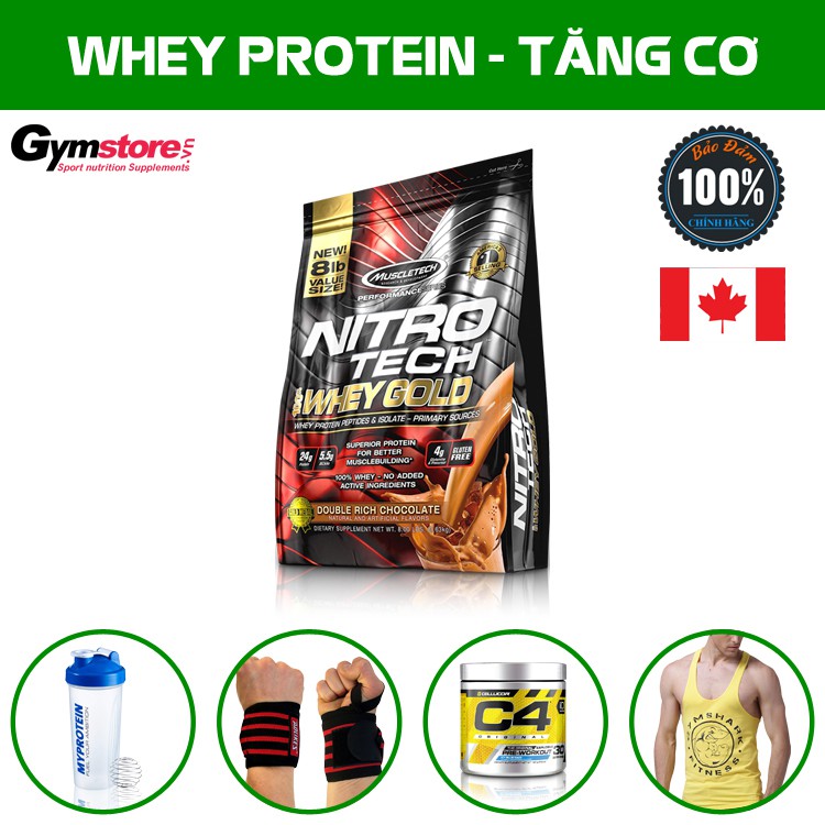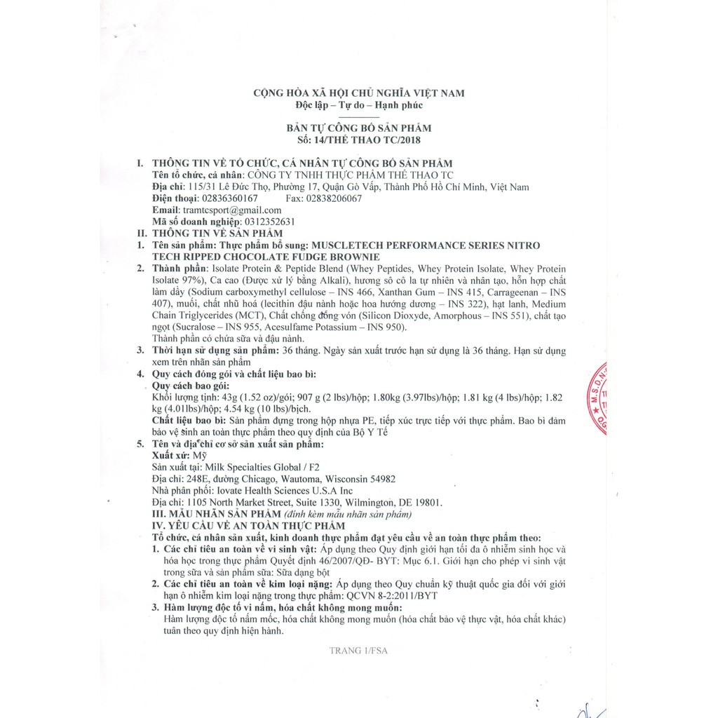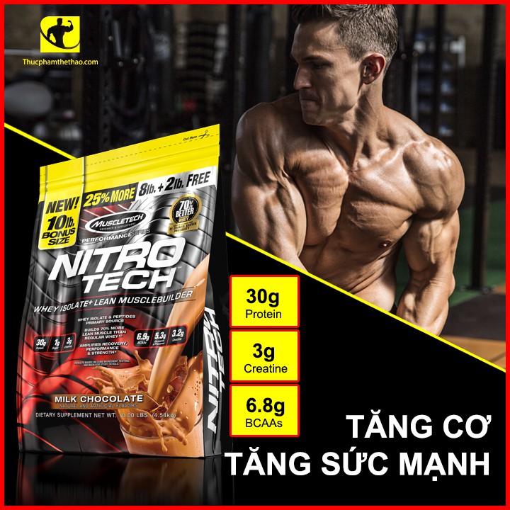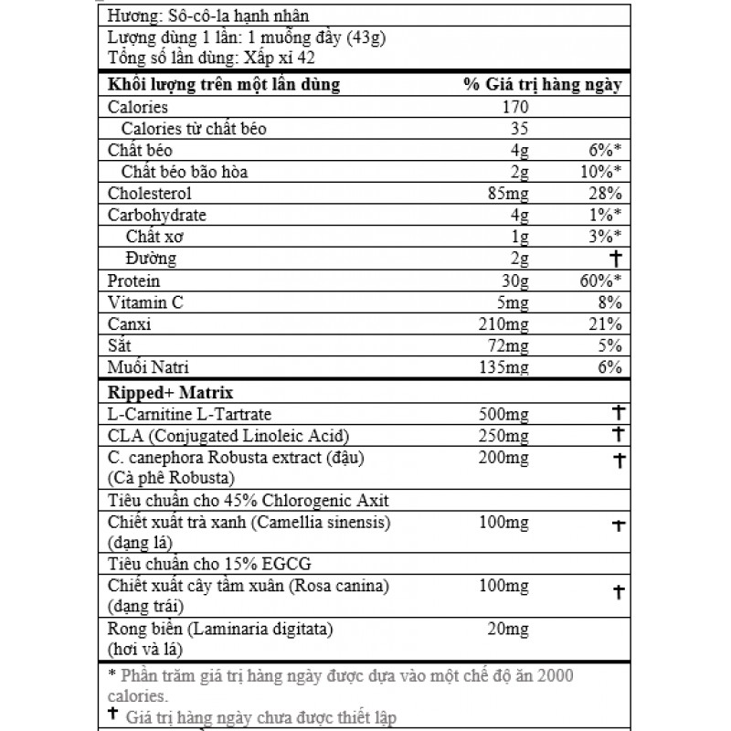 HÀNG CÔNG TY – TEM NHÃN ĐẦY ĐỦ NITRO-TECH RIPPED là sản phẩm cải tiến mới nhất của Muscle Tech. Công thức cải tiến này kết hợp giữa 2 loại whey protein peptides và whey protein cô lập với thành phần có công dụng giảm cân đã được kiểm nghiệm khoa học. Công thức 7 trong 1 này còn chứa CLA, MCTs, L-carnitine L-tartrate, chiết xuất trà xanh, chiết xuất cây tầm xuân và bột rong biển. Hãng Muscle tech đã thiết kế công thức protein siêu tinh khiết kết hợp với hiệu quả giảm cân đặc biệt này-một công thức không giống bất kỳ công thức nào trước đây. NITRO-TECH RIPPED cung cấp 30g hỗn hợp whey peptides và whey cô lập để có lợi cho sự tiêu hoá, dễ pha và chứa hàm lượng cao các amino axit thiết yếu (BCAAs). NITRO-TECH RIPPED đặc điểm là có thành phần chủ chốt C. canephora robusta đã kiểm nghiệm qua 2 phương pháp nghiên cứu double-blind và placebo-controlled là giúp người dùng giảm cân. Người được thử nghiệm có dùng thành phần chủ chốt này giảm trung bình gần 5kg (trong đó nhóm sử dụng giả dược giảm gần 2,5kg) trong vòng 60 ngày tuân theo chế độ ăn có lượng calories thấp và gần 1,7 kg (trong đó nhóm sử dụng giả dược giảm gần 0,6 kg) trong vòng 8 tuần tuân theo chế độ ăn giảm calories và chế độ tập luyện vừa phải. Như vậy khả năng giảm cân đã tăng gấp đôi. NITRO-TECH RIPPED cung cấp 30g protein có giá trị sinh học cao nhất. Đây là một trong những nguồn protein sạch nhất hiện nay dành cho vận động viên. Whey peptides là những amino acids chứa những thành phần chiết xuất từ những phân tử whey protein dài hơn hẳn. Whey peptides có thể thúc đẩy sự hồi phục cơ sau tập luyện. Hơn hết whey peptides có giá trị sinh học đo lường khả năng cơ thể hấp thụ và sử dụng cao nhất trong bất kỳ nguồn protein nào. Hướng dẫn sử dụng: Pha 1 muỗng (muỗng đầy) với 240 ml nước hoặc sữa. Uống 30 tới 60 phút trước 2 bữa ăn chính một ngày. Để có được kết quả tốt nhất, kết hợp với chế độ ăn kiêng hoặc tập luyện trong vòng 60 ngày. Đọc kỹ hướng dẫn sử dụng trước khi dùng. Lưu ý: Sản phẩm này không phải thuốc. Không có tác dụng thay thế thuốc chưa bệnh.