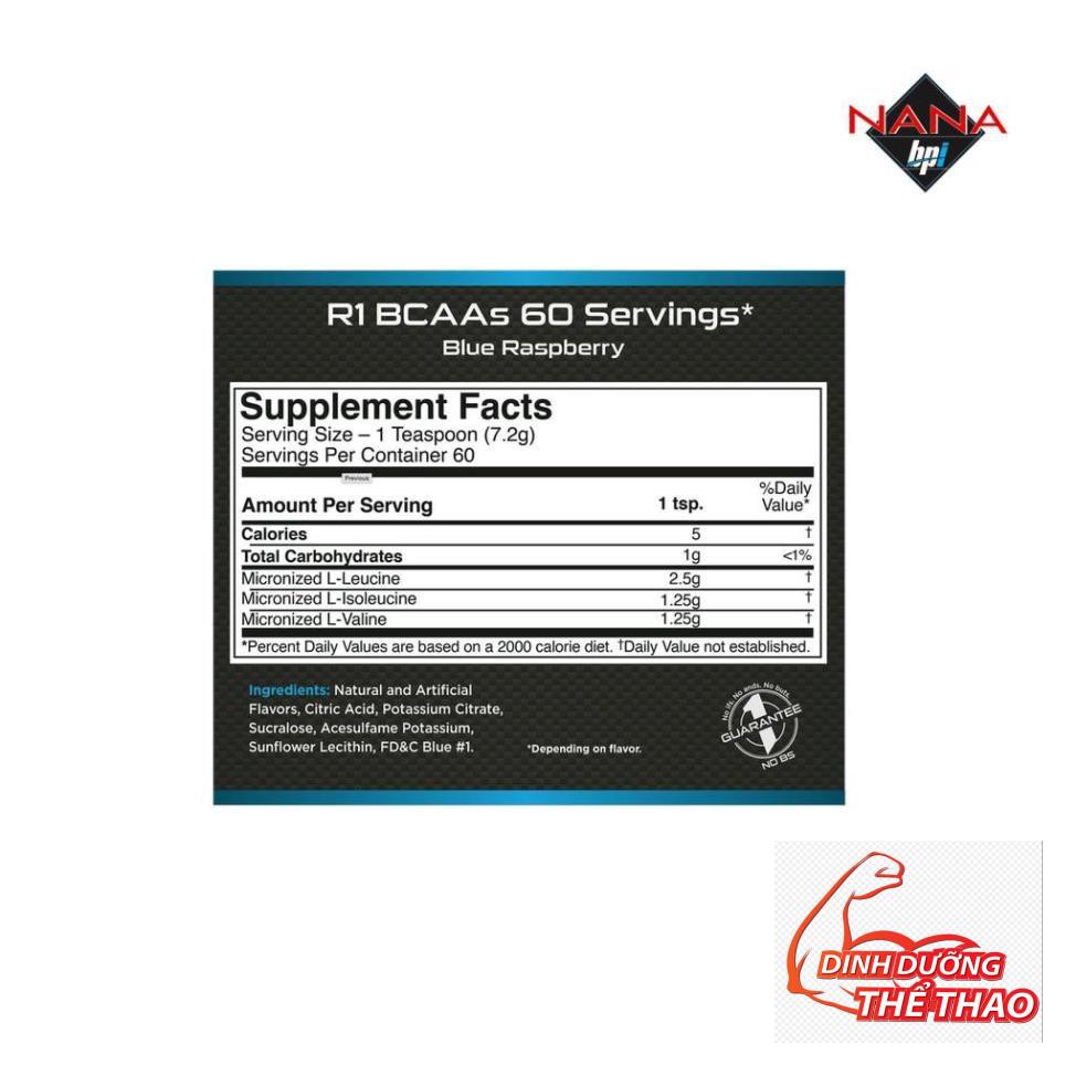 - R1 BCAA là sản phẩm thuần nguyên chất với tỉ lệ 2:1:1 đạt hiệu quả tốt nhất cho việc hồi phục, phát triển cơ bắp. - Thành phần đơn giản và thuần túy nhưng khả năng hấp thụ của sản phẩm rất tốt. Hàm lượng các chất cho 1 lần dùng: - 2.5g L-Leucine. - 1.25g L-Isoleucine - 1.25g L-Valine Cách dùng BCAA - Cho một muỗng BCAA (7.2g) vào khoảng 500ml nước, điều chỉnh lượng nước phù hợp với khẩu vị của bạn, ngon hơn khi uống lạnh. Sử dụng trong lúc tập luyện hoặc sau tập luyện. - Trung bình một ngày bạn dùng khoảng 5-10g BCAA là đủ đối với nữ còn đối với nam thì có thể gấp đôi hay gấp ba lần.