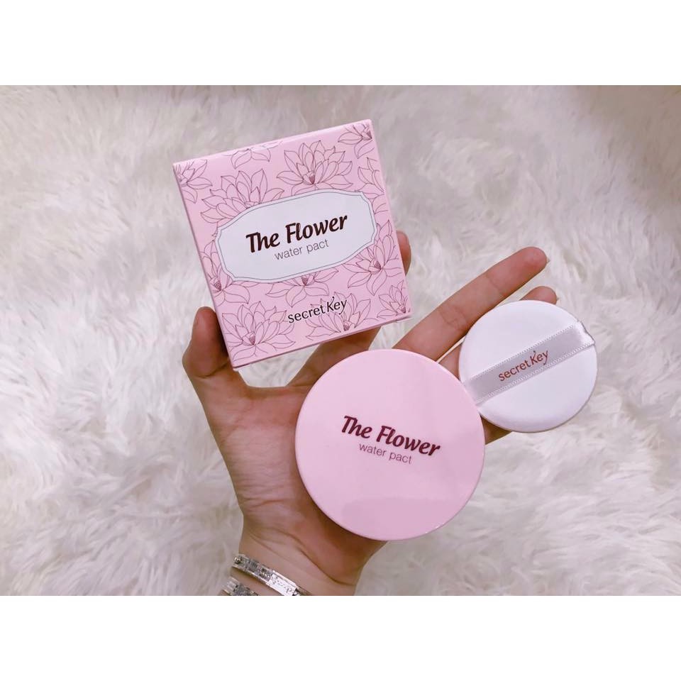 Kem Phấn Trang Điểm Secret Key The Flower Water Pact SPF50+/PA+++ Kem Phấn Trang Điểm Secret Key The Flower Water Pact là sản phẩm makeup 4-in-1 mang đến lớp nền vừa mỏng mịn, vừa nhanh-gọn-lẹ mà không cần phải đánh lên da tầng tầng lớp lớp các thể loại như kem lót, phấn nền, che khuyết điểm, kem chống nắng… giúp các nàng tiết kiệm tối đa thời gian make up mỗi ngày. – Kết cấu phấn phấn mềm nhưng không hề ướt, giúp tạo một lớp nền tự nhiên như không makeup. – Độ che phủ của sản phẩm khá tốt, có thể “giấu nhẹm” lỗ chân lông to, các vết thâm hay vết nhăn nhỏ… Nếu nàng nào có khuyết điểm “nặng đô” hãy nhờ thêm sự trợ giúp của kem che khuyết điểm để lớp nền hoàn hảo hơn nha. – Được chiết xuất từ hoa sen và 4 thành phần thảo mộc nên vô cùng lành tính và giàu dưỡng chất giúp bổ sung độ ẩm, chống lão hóa cho da. – Vì có thành phần dưỡng ẩm nên phấn rất bám da và lâu xuống tông mà không xảy ra tình trạng mốc hay cakey. Chỉ cần một lớp phấn mỏng, da bạn sẽ “lột xác” ngay, trở nên tươi tắn hơn. – Sản phẩm có chỉ số SPF50+/PA+++ giúp bảo vệ da dưới ánh nắng mặt trời, ngăn ngừa da lão hóa và chống nhăn hiệu quả. – Hộp phấn có thiết kế tông màu hồng rất đáng yêu, đảm bảo những cô nàng bánh bèo sẽ phải “đổ gục” trước em ấy ngay, kèm theo bông mút “siêu êm” và gương giúp bạn tiện cho việc tân trang lại lớp nền.