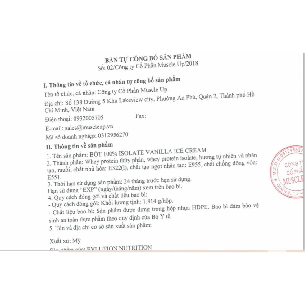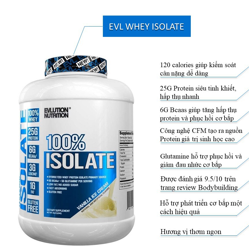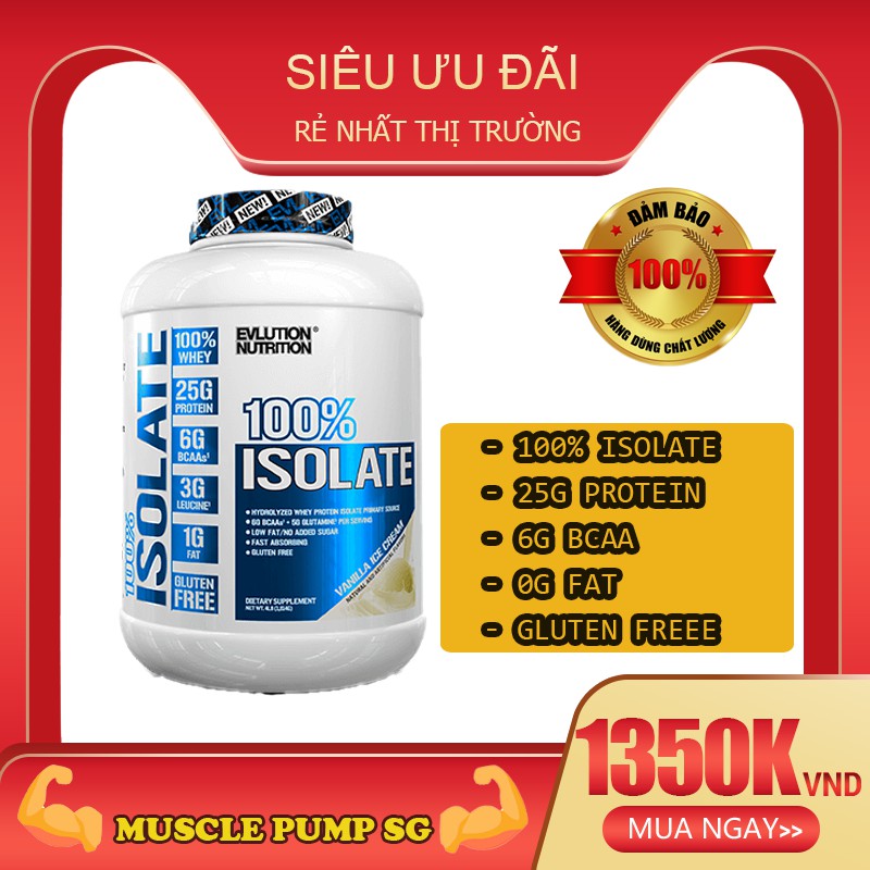 EVL 100% ISOLATE là sản phẩm gì: EVL 100% ISOLATE – là một trong những sản phẩm chiến lược của EVL, khi thành phần là 100% Hydrolyze Isolate Whey Protein! Hoàn toàn ZERO Whey Concentrate, loại Whey thô thường được dùng trong các dòng Whey cấp thấp. Là một sản phẩm có chất lượng tuyệt vời nhưng giá cả lại rất hợp lý. Thành phần chính Trọng lượng : 5 lbs ~ 2.27 kg (70 Servings) Hàm lượng : 120 calories + 25g protein + 6g BCAAs Thành phần chính : Hydrolyzed Whey Isolate, BCAAs, Glutamine Thương hiệu : Evlution Những lợi ích của EVL 100% ISOLATE: Cung cấp 25g Hydrolyzed Whey Protein Isolate, loại Protein cực kỳ tinh khiết, hấp thụ cực nhanh giúp phát triển cơ bắp tối ưu. Công nghệ sản xuất CFM tạo nên nguồn protein có giá trị sinh học cao với cơ thể. 6g BCAAs tăng khả năng hấp thụ protein, giúp phục hồi cơ bắp, chống dị hóa cơ và phát triển cơ bắp hiệu quả. Không gây nóng, nổi mụn, khó tiêu. Không chứa Gluten, chất tạo màu, tạo mùi. Sản phẩm được đánh giá cao: EVL 100% ISOLATE được đánh giá 9.5/10 trên trang Website Bodybuilding.com – đây là trang bán và review Supplement nổi tiếng nhất của USA hiện nay. Con số rate 9.5 này được người tiêu dùng bình chọn trong nhiều năm liên tiếp. Hướng dẫn sử dụng EVL 100% ISOLATE: Thời điểm sử dụng sản phẩm tốt nhất là sáng sớm ngay sau khi ngủ dậy 1 lần và ngay sau khi tập luyện sử dụng 1 lần. Mỗi lần dùng 1 muỗng pha với 250-300ml nước lọc (tùy khẩu vị mỗi người để thêm, bớt nước). Lưu ý không nên pha Whey ISO 100 với nước nóng gây vón cục, sử dụng liền sau khi pha, không nên để lâu không đảm bảo dinh dưỡng. Sản phẩm không phải là thuốc và không có tác dụng thay thế thuốc chữa bệnh #Whey #Wheyprotein #Wheyiso #Wheyisolate #evlwhey #Wheyhydrolyzed #Hydrolyzedwhey Muscle Pump SG - Hân Hạnh Được Phục Vụ ! Địa chỉ kho hàng: Lê Trọng Tấn, P. Sơn Kỳ, Q. Tân Phú