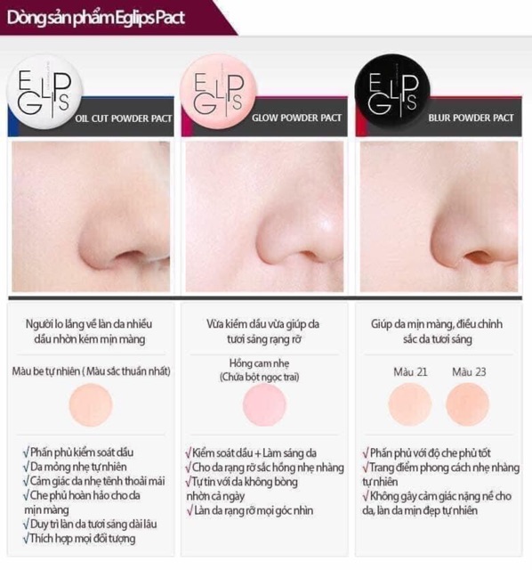 🍒 PHẤN EGLIP bản đen 👉🏼 Xuất xứ : Hàn Quốc 🔖 Thông tin sản phẩm : ➖ Làm mờ khuyết điểm rất tốt đặc biệt là các vùng lỗ chân lông to hay vùng quầng thâm dưới mắt. Kết cấu phấn nhẹ tênh như các loại phấn phủ bột và cho lớp nền không quá lì. ➖ Kiểm soát bã nhờn, không gây bóng nhờn, giúp duy trì lớp trang điểm suốt cả ngày. ➖ Có độ che phủ tương đối cao, đặc biệt se khít lỗ chân lông cho da tạo nên một lớp trang điểm hoàn hảo. ➖ Hạt phấn siêu nhỏ, mịn, trong veo, độ bám cao, khả năng thấm hút mồ hôi tốt. 👉🏼 Đối với các bạn da dầu nhiều hoặc bị mụn, lỗ chân lông to thì không cần lo lắng vì đây là sản phẩm trang điểm vô cùng hữu hiệu. 🥉Blur Powder Pact ( hộp đen): là loại phấn lì, giúp bề mặt da trơn mịn và căng tràn sức sống . Vỏ hồng la loại cho tong da hồng hào