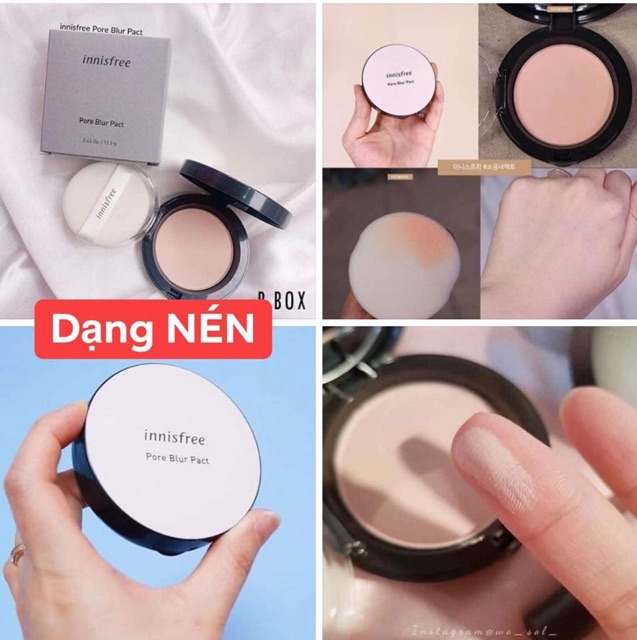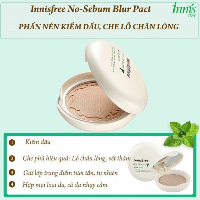 😊 Phấn nén kiềm dầu đình đám của nè mấy chế =)). Trời ơi đáng yêu hết sức à 😀 🌺Tác dụng của bé là kiềm dầu, hộp màu trắng này là loại mới nhất của Innis với tính năng che phủ tốt hơn loại xanh nhé 😁 ❤ Phấn Phủ Nén Innisfree No Sebum Blur Pack ☀ No Sebum Blur Pact mới ra mắt của được chiết xuất từ các khoáng chất tự nhiên của đảo Jeju Hàn Quốc và chiết xuất bạc hà, camellia, khoáng chất, trà xanh ... giúp kiểm soát lượng dầu nhờn, mồ hôi và điều chỉnh độ ẩm giúp da mịn màng trắng sáng. ☀ Đây là sản phẩm lành tính, rất an toàn và đặc biệt phù hượp với làn da nhạy cảm ☀ Sản phẩm có khả năng tajop độ ẩm cân bằng trên da giúp da thông thoáng không bị bí dầu nhờ những hạt phấn nhỏ có tác dụng hút nhiều dầu, mồ hôi ^^ Bạn có thể trang điểm khi bị mụn mà không cần phải lo lắng các vấn đề về da nữa ☀ Phấn co tone màu phù hợp với tone màu da giúp bạn che phủ hiệu quả các vấn đề trên da như lỗ chân lông to, vết thâm...