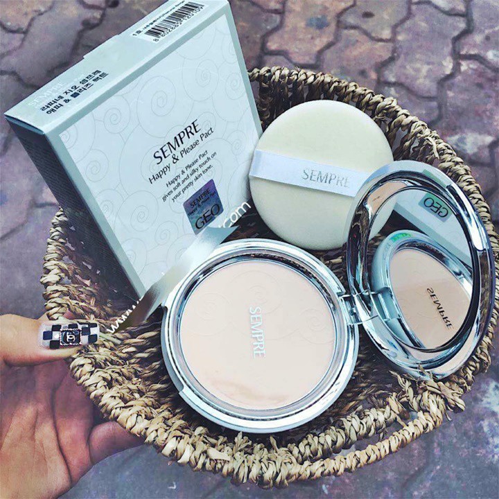 💦Phấn nền là lựa chọn tuyệt vời và không thể thiếu của chị em trong việc trang điểm hàng ngày tuy nhiên việc lựa chọn cho mình bộ phấn nền phù hợp và an toàn cho da là việc rất cần thiết. 💦Phấn GEO siêu mịn Sempre Happy & Please Pact được tạo thành từ các hạt phấn bột rỗng dưới dạng nén, có tác dụng 2 trong 1, chức năng hút dầu cao, độ bám tốt mang lại một lớp phấn phủ mịn màng tự nhiên và khô thoáng . - Thành phần: Tinh chất từ nước biển, cây xương rồng, hoa trà và rau câu biển, ngọc trai hoàn toàn lành tính và tự nhiên, sẽ giúp bạn có một lớp makep hoàn hảo và mềm mịn như lụa Với kiểu dáng sang trọng, phấn GEO siêu mịn Sempre Happy & Please Pact được tạo thành từ các hạt phấn bột rỗng dưới dạng nén, có tác dụng 2 trong 1, chức năng hút dầu cao, độ bám tốt mang lại một lớp phấn phủ mịn màng tự nhiên và khô thoáng.