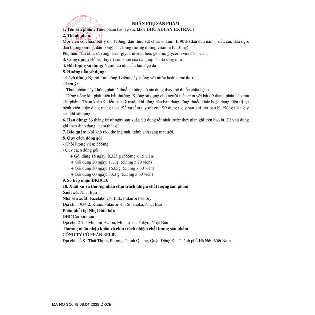 Viên Uống DHC Trắng Da giúp làm mềm và dưỡng ẩm, ngăn ngừa các dấu hiệu lão hóa da, loại bỏ các vết thâm đen. Với thành phần chính được chiết xuất từ hạt COIX – một loại hạt du nhập vào Nhật Bản từ khoảng thế kỷ VIII và chiết xuất từ lúa mạch Viên Uống DHC Trắng Da có tác dụng: – Bổ sung các dưỡng chất cho da như: Vitamin E, Vitamin B1, B12, axit linoleic, axit palmitic, axit stearic, axit cis-8-oc-tadecenoic …Nhờ đó, Viên Uống DHC Trắng Da 20 Viên giúp giúp làm mềm và dưỡng ẩm. – Ngăn ngừa các dấu hiệu lão hóa da, loại bỏ các vết thâm đen. Hướng dẫn sử dụng: Viên Uống DHC Trắng Da: 1 viên/ngày, uống vào buổi tối trước khi đi ngủ Lưu ý: Sản phẩm không phải thuốc và không thể thay thế thuốc chữa bệnh 𝐇𝐞̣̂ 𝐭𝐡𝐨̂́𝐧𝐠 𝐜𝐮̛̉𝐚 𝐡𝐚̀𝐧𝐠 𝐭𝐚̣𝐢 𝐇𝐚̀ 𝐍𝐨̣̂𝐢 📍 CS1: Số 237 Bạch Mai 📍 CS2: Số 186 Hàng Bông 📍 CS3: Số 7 Ngõ 100 Tây Sơn 📍 CS4: Số 104 Ngõ 72 Nguyễn Chí Thanh 📍 CS5: Số 152c Triệu Việt Vương 📍 CS6: Số 61 Vạn Bảo 📍 CS7: 72 Trần Phú - Hà Đông 📍 CS8: Ngõ 215 - 106D6 Tô Hiệu - Quận Cầu Giấy