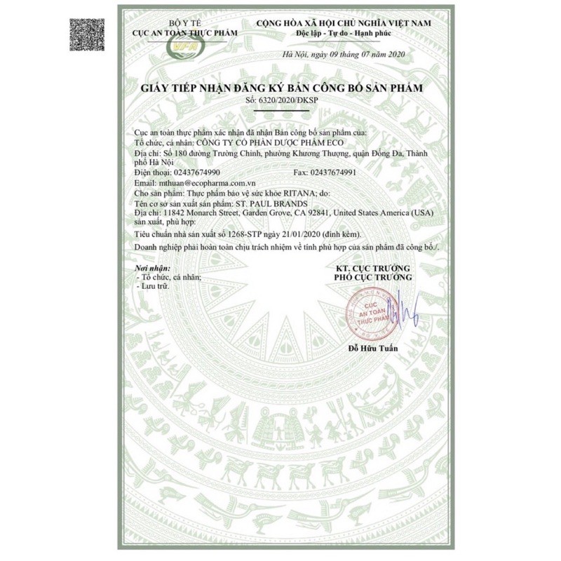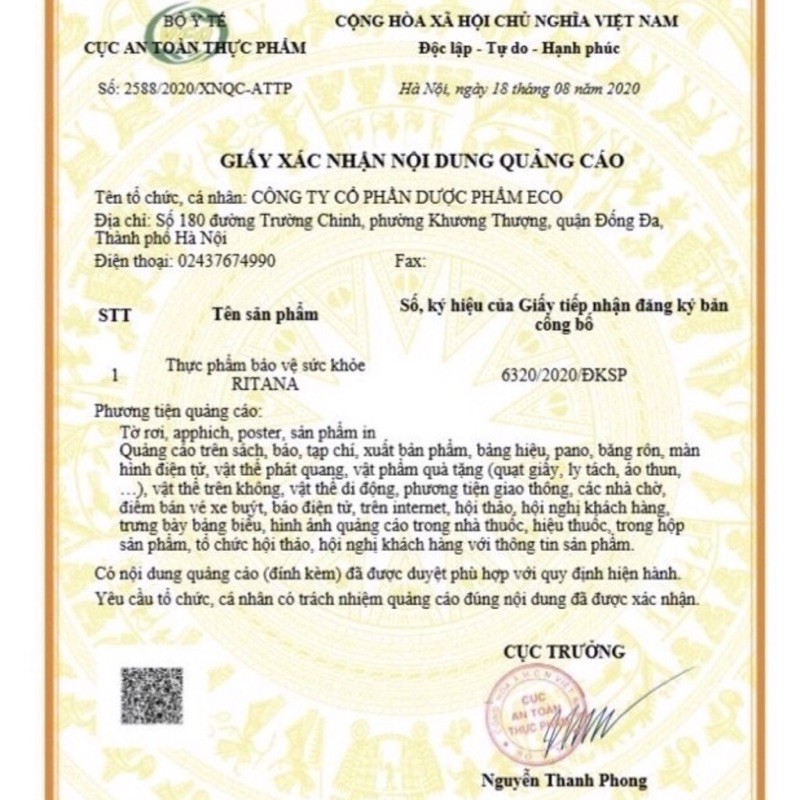 🔥CÔNG DỤNG CỦA RiTANA RiTANA với công thức toàn diện đem lại hiệu quả ưu việt cho làn da bạn ✔️TRẮNG DA:Trắng hồng toàn thân tự nhiên sau 8 - 12 tuần.(*) ✔️MỜ SẠM NÁM:Làm mờ sạm nám, vết thâm mụn, ngăn ngừa vết sạm nám mới. ✔️TRẺ HOÁ DA (CHẬM LÃO HOÁ) Da căng sáng, săn chắc, mịn màng, chậm lão hoá, giảm nếp nhăn, thu nhỏ lỗ chân lông. ✔️CHỐNG NẮNG, "NHẢ NẮNG" Tăng hiệu quả chống nắng trước tia UVA và UVB, phục hồi tổn thương do nắng nhanh hơn và hiệu quả hơn. ✔️BẢO VỆ VÀ TĂNG CƯỜNG SỨC KHOẺ CHO DA Hỗ trợ kháng viêm, giảm kích ứng - tăng cường "miễn dịch" cho da. Chống oxy hoá, thải độc cơ thể, thải độc da. 🔥 THÀNH PHẦN: 👉L-GLUTATHIONE L-Glutathione là một chất chống oxy hóa mạnh mẽ, giúp cải thiện đáng kể màu sắc và tăng sức đề kháng cho da. Đào thải độc tố da (kim loại, hóa chất), ngừa lão hóa nhờ tác dụng trung hòa gốc tự do 👉SAKURA Tinh chất Sakura được nghiên cứu và ghi nhận nhiều tác dụng: ức chế hoạt động men Tyrosinase, giảm hình thành Melanin, ngừa lão hóa, giảm nếp nhăn, duy trì độ căng mịn của da, thu nhỏ lỗ chân lông, trẻ hóa làn da. 👉LỰU Tinh chất Lựu được nghiên cứu và chứng minh khả năng ức chế hoạt động của tế bào Melanocytes, từ đó giảm Melanin, thúc đẩy tái tạo da nhờ tăng tổng hợp Collagen, giảm tổn thương cháy nắng do tác động của tia UV. 👉COLLAGEN Collagen là một trong những thành phần tạo nên bộ khung cấu trúc nền của làn da, giúp da săn chắc và căng mịn, tăng độ đàn hồi, giảm nếp nhăn, cung cấp độ ẩm tự nhiên, giảm mất nước, giúp da mềm mịn. 👉CÁC TINH CHẤT KHÁC P. Leucotomos, Maca Root PE (Lepidium Meyenii Ginseng), White Peony, Lingonberry Fruit, White Jelly Fungus, Sky Fruit, Lemon Powder, Uva Ursi Leaf, Mulberry, Leaf, Litchi Fruit, Magnesium Stearate tạo nên công thức trắng da, mờ sạm nám vượt trội. 🔥CÁCH DÙNG : ngày 2 viên sau ăN 4. ĐỐI TƯỢNG SỬ DỤNG Nam, nữ trên 18 tuổi Sản xuất tại Mỹ + Đóng gói: 60 viên + Bảo quản: Nơi khô ráo, thoáng mát, nhiệt độ dưới 30 độ C, tránh ẩm và ánh nắng mặt trời, để xa tầm tay trẻ em. + Nhà sản xuất: St. Paul Brands - 11842 Monarch Street, Garden Grove, CA 92841, U.S.A. + Nhập khẩu và phân phối: Công ty Cổ phần Dược phẩm ECO + Địa chỉ: 148 Hoàng Hoa Thám, P.12, Q. Tân Bình, TP. Hồ Chí Minh. + Trụ sở chính: 180 Trường Chinh, Phường Khương Thượng, Quận Đống Đa, TP. Hà Nội Sản phẩm này không phải là thuốc và không có tác dụng thay thế thuốc chữa bệnh. Không dùng cho phụ nữ có thai hoặc cho con bú. Hiệu quả của sản phẩm tùy thuộc vào thể trạng của từng người. Thông tin về công dụng sản phẩm công bố theo giấy phép SĐK: 6320/2020/ATTP-ĐKSP