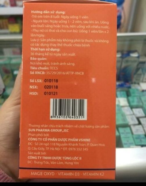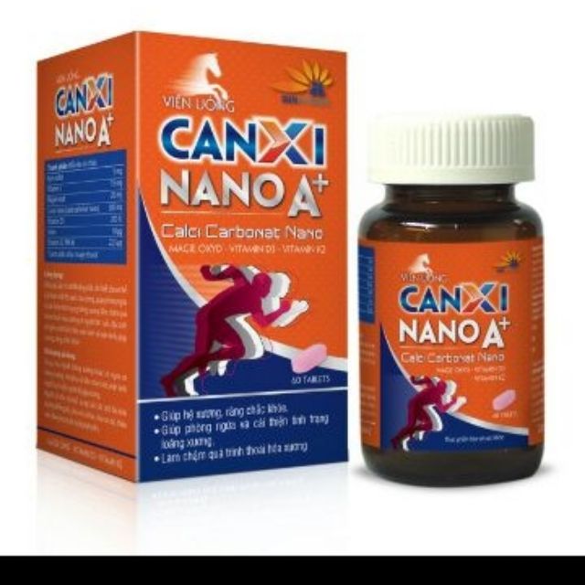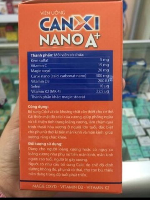 Thành phần : Canxi Nano ,Vitamin D3, vitamin K2, magie oxyd, vitamin C ,Selen ,kẽm sunfat. Công dụng: Bổ sung canxi cho phụ nữ mang thai và cho con bú người già trẻ em. Người bị thiếu canxi hoặc sau phẫu thuật xương. Người bị thoái hóa xương khớp tê bì chân tay do thiếu canxi. Liều dùng: trẻ em trên 8 Tuổi ngày 1 viên . Người lớn 1 đến 2 viên /ngày .sau ăn sáng hoặc trưa tốt nhất là uống với nhiều nước. Chú ý : sản phẩm này không phải là thuốc không có tác dụng thay thế thuốc chữa bệnh Quy cách đóng gói: lọ 30 viên lọ 60 viên. Phân phối bởi : công ty Cổ phần Dược phẩm vshine.