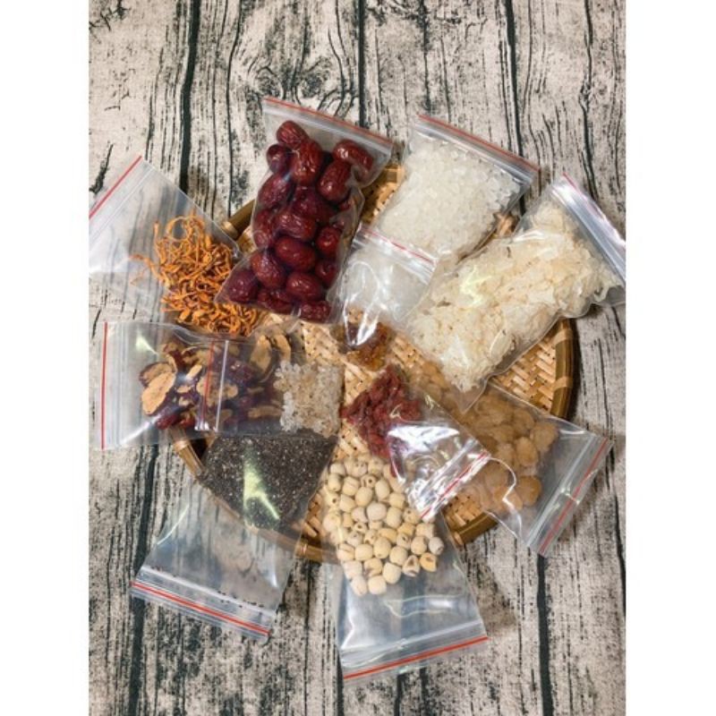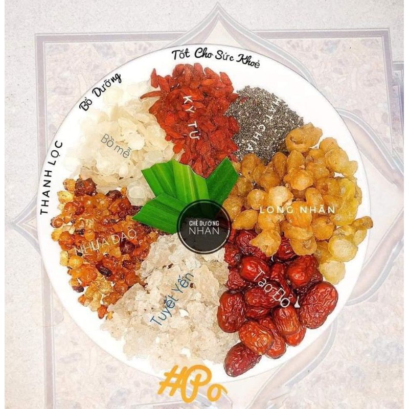 SET CHÈ DƯỠNG NHAN bao gồm: 🌸 Tuyết Yến 🌸 Bồ Mễ 🌸 Nhựa Đào 🌸 Long Nhãn 🌸 Kỷ tử 🌸 Táo đỏ 🌸 Hạt chia Công Dụng nhựa đào ngoài tác dụng làm sạch máu, hạ huyết áp, giảm căng thẳng, nhựa đào còn là món ăn chứa nhiều collagen tự nhiên giúp chống lão hóa, làm đẹp da vô cùng hữu hiệu được các vương tôn quý tộc ngàn xưa tin dùng. ❤️Tất cả nguyên liệu là loại ngon nhất. 🌸🌸Công dụng: - Tuyết yến 🍀🍀 +có hàm lượng dinh dưỡng tương tự như tổ yến và sau khi ngâm ra nó trắng, ăn không tanh như yến +ức chế hấp thu đường => làm giảm đường huyết, rất tốt cho ng tiểu đường, thừa cân, phòng béo phì, tăng huyết áp +duy trì độ ẩm của da, căng da, giảm chảy sệ, săn chắc cơ phu, nhuận tràng thông tiện +tăng cường miễn dịch, bổ phế. - Nhựa đào:🌻🌻 + hạ huyết áp, giảm căng thẳng + chứa nhiều collagen tự nhiên giúp chống lão hóa, làm đẹp da 💐💐CÁCH NẤU💐💐 Chuẩn bị: Cho 4 – 6 người ăn 🍀Nhựa đào: 10g (khoảng 7 – 10 cục) 🍀Tuyết yến: 5g (2 – 3 cục) 🍀Bồ mễ: 10g 🍀Táo đỏ: 6 quả 🍀Kỷ tử: 10g (một nhúm nhỏ) 🍀Long nhãn: 20g Nước lọc: 1500ml Đường phèn vừa ăn Có thể nấu cùng Hạt sen, Bách hợp, Hạt Chia,… Cách nấu chè nhựa đào tuyết yến 🌺🌺🌺Nhựa đào, Tuyết yến ngâm trong từng bát tô riêng. Nhựa đào, Tuyết yến ngâm qua đêm. Tuyết yến ngâm từ 16 – 18h. Nhựa đào ngâm ít nhất 12h. Tuyết yến ngâm đạt là nó trắng trong ạ Sau khi ngâm nở, nhặt bỏ tạp chất (nếu có). Đổ ra rổ lọc, để ráo nước. Cho Nhựa đào vào nồi, thêm nước lượng thích hợp, tùy theo khẩu vị thích ăn đặc hay ăn loãng. Nếu nấu chè với Hạt sen, Bách hợp khô thì cũng cho vào nồi ngay. Đun trong 30 phút. Trong khi nấu Nhựa đào thì cắt lát hoặc khía vài đường trên quả Táo đỏ. Đến khi Nhựa đào đã chín nở bung thì bỏ Tuyết yến vào nồi. Đun trong 5 phút. Thêm đường phèn lượng vừa ăn, khuấy tan rồi tắt bếp. Sau khi tắt bếp thì mới cho Táo đỏ, Long nhãn và Kỷ tử vào khuấy đều lên, đợi sau khoảng 60p thì thưởng thức. Nếu cho long nhãn từ đầu sẽ hay bị nồng Có thể ăn nóng hoặc bỏ tủ lạnh ăn mát. Khi nấu cũng có thể thêm hạt chia. Hsd: 6 tháng