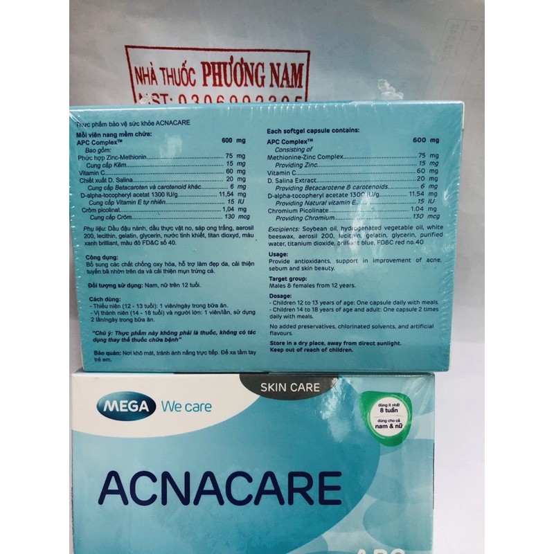 ACNACARE-Hộp 30 viên.Xem hướng dẫn sử dụng trên hình ảnh sản phẩm shop Phương Nam thiên nhiên việt chụp.Hạn sử dụng : 2 năm kể từ ngày sản xuất in trên bao bì(date luôn mới)