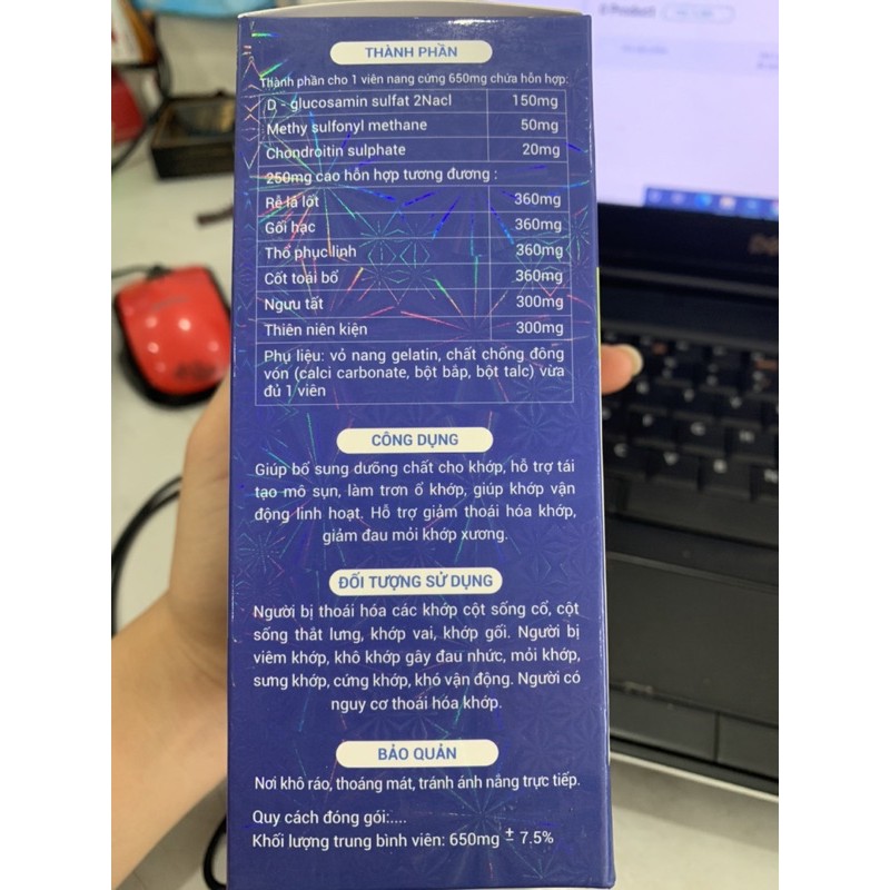 công dụng giúp bổ sung dịch khớp, giúp khớp vận động linh hoạt, tái tạo mô sụn khớp Sản phẩm từ thảo dược tự nhiên an toàn không gây tác dụng phụ Sử dụng ngày 4 viên chia 2 lần uống sau ăn 30p Lọ 60 viên