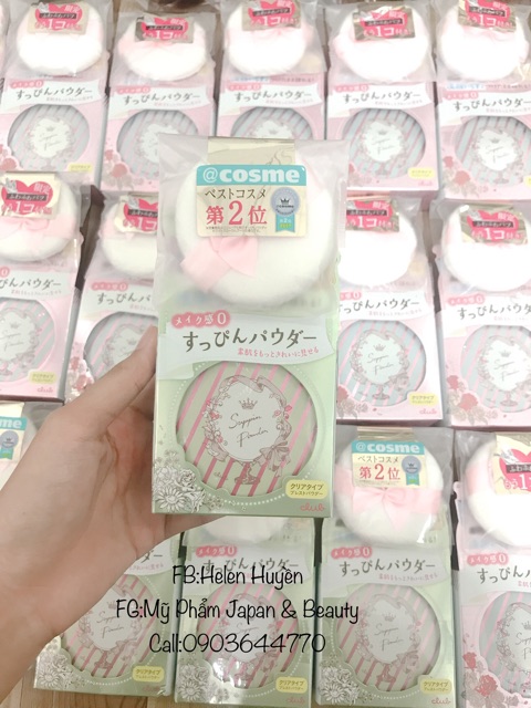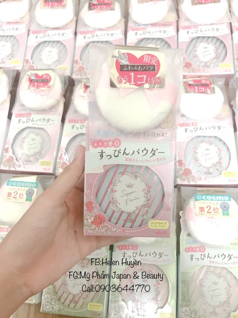 PHẤN PHỦ SUPPIN POWDER NEW NHA + Phấn phủ Phấn phủ Suppin Powder là sản phẩm mỹ phẩm nổi tiếng của Nhật, được rất nhiều phụ nữ Nhật tin dùng đuợc review rất tốt hiện nay, sản phẩm dành cho những chị em yêu thích lối trang điểm tự nhiên mà vẫn đảm bảo độ che phủ tốt cho da. + Điểm đầu tiên ấn tượng chính là thiết kế hộp phấn vô cùng dễ thương,xinh xắn ,bông phấn thì cực kỳ mềm mịn, hương thơm lại nhẹ nhàng phảng phất rất yêu. + Hạt phấn siêu nhỏ, chất phấn cực mịn và nhẹ, tan vào da ngay tức thì để làn da trở nên trong suốt hoàn hảo mà không lo bị cakey hay tạo các rãnh, nếp nhăn trên da. + Với Chiết Xuất tảo , aloe vera lá chiết xuất, dầu dừa, chè lá chiết xuất, R. chiết xuất từ quả multiflora, axit hyaluronic Na, Scutellaria chiết xuất từ rễ, collagen hòa tan, (+/-), titan oxit, oxit sắt ,và các thành phần khác.... + Phấn cực kỳ lành tính, KHÔNG chứa Paraben & hương liệu tổng hợp, phù hợp với mọi loại da. + Hỗ trợ cho lớp nền được đều màu, sáng tông, điều tiết mồ hôi, dầu thừa và lâu trôi đến 24 giờ. Có bản xanh lá và hồng siêu xinh luôn nha❤️