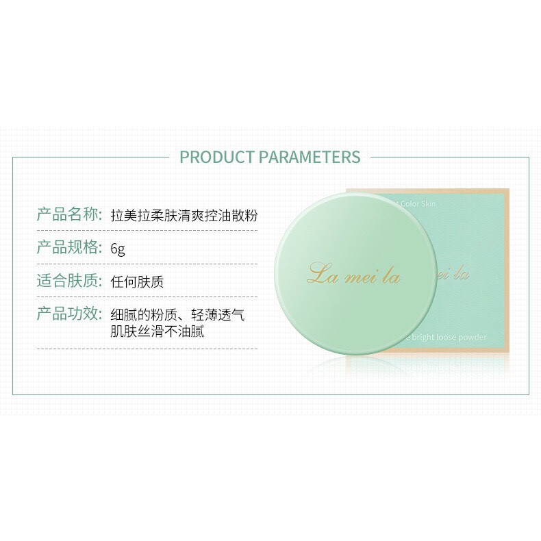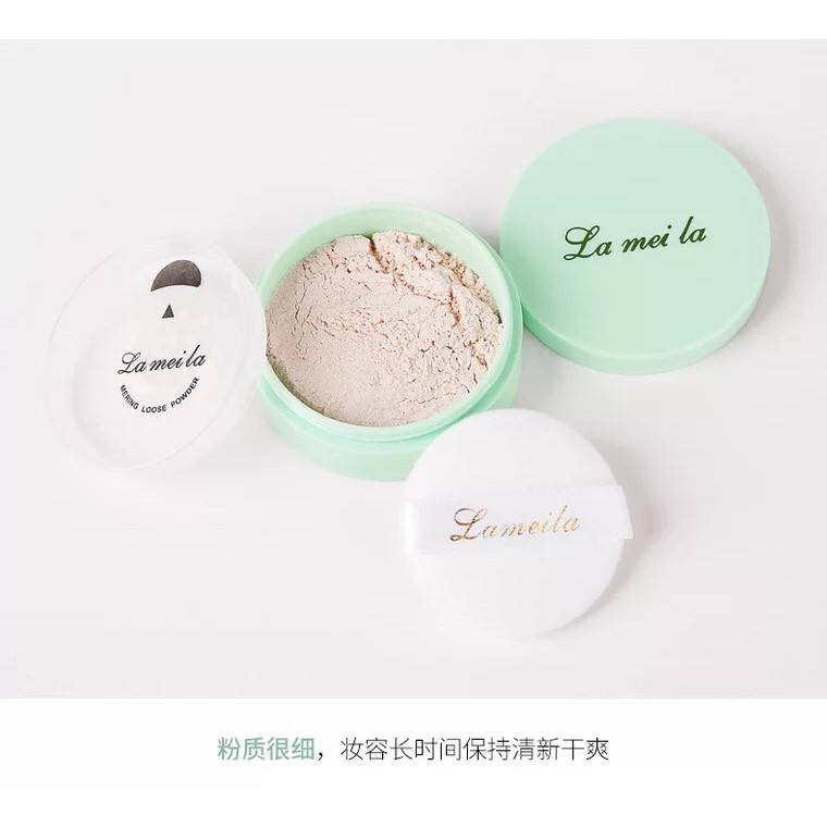 Phấn phủ kiềm dầu dạng bột của Lameila Được tinh chế từ đá núi lửa với các hạt phấn liti có độ bám cao. Phấn phủ dạng bột của Lameila loại bỏ hoàn toàn chất dầu thừa trên bề mặt da mà không gây tắc nghẽn lỗ chân lông Phấn phủ dạng bột của Lameila che khuyết điểm và các nếp nhăn tạo nên một làn da hoàn hảo và mịn màng. Đặc biệt kiềm dầu cực tốt 6-8h Sử dụng phấn phủ dạng bột của Lameila giúp lớp trang điểm được lâu và không bị xuống tone. Sản phẩm thích hợp với mọi loại da Hướng dẫn sử dụng: dung cọ trang điểm hoặc bông phấn có sẵn trong sản phẩm chạm nhẹ lên bề mặt sao cho khuôn mặt đều màu.