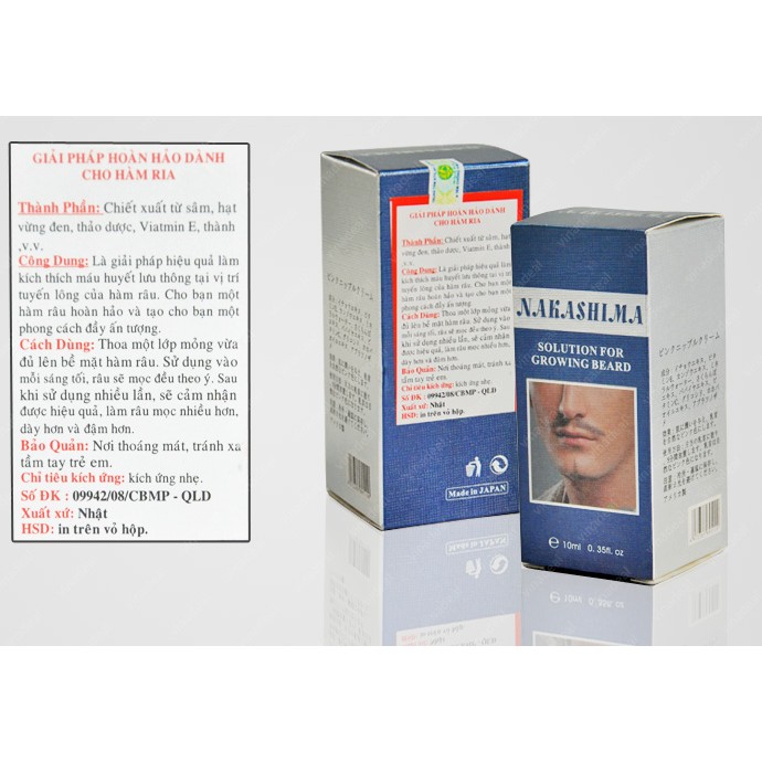 Thuốc mọc râu Nakashima với thành phần tự nhiên được chiết xuất từ nhân sâm, hạt vừng đen, thảo dược, vitamin E, giúp tác động đến nang lông ở vị trí cần mọc râu được phát triển để râu mọc đều, đúng nơi, và an toàn cho người sử dụng, được phái nam ưa chuộng và có xuất xứ từ Nhật Bản. Công dụng: - Thuốc mọc râu Nakashima với thành phần thiên nhiên với chiết xuất từ nhân sâm, hạt vừng đen, thảo dược, vitamin E, giúp râu mọc đều, đen và an toàn. - Dạng dầu lỏng, không nhờn rít, hay khó chịu, có thể sử dụng cho cả lông, tóc, chân mày. - Giúp râu mọc đều, đúng vị trí, hiệu quả nhanh, với hương thơm nhẹ dịu. - Kích thích máu huyết lưu thông tại vị trí tuyến lông của hàm râu, sẽ cho bạn một hàm râu dày, dài và rậm chỉ sau một tuần sử dụng. - Thuốc kích thích mọc râu Nakashima là sản phẩm được sản xuất theo công nghệ sinh học tốt nhất của nhật bản kết quả đảm bảo chắc chắn và an toàn vì sản phẩm được nhập khẩu từ Nhật Bản. - Đem lại kết quả rõ rệt chỉ sau 1 tuần so với người có cơ địa phù hợp nhất và 1 – 2 tháng so với những người còn lại. - Nakashima có tác dụng hầu hết những vùng da có xuất hiện lỗ chân lông hoặc thưa lỗ chân lông. Với những vùng không có lỗ chân lông, thuốc mọc râu an toàn và hiệu quả Nakashima sẽ kích thích lỗ chân lông trước, sau đó sẽ kích thích mọc râu. Đặc biệt, với những vùng da đã có sẵn lông tơ hoặc có râu thưa thớt, thuốc Nakashima sẽ phát huy tác dụng tối đa và nhanh chóng hơn hẳn so với các vùng da khác. - Dung dịch Nakashima thấm rất nhanh, nên không gây cảm giác quá nhờn rít, hay gây khó chịu cho người dùng. Hương thơm nhẹ dịu từ thảo mộc của Nakashima cho bạn cảm giác tự tin hơn mỗi khi sử dụng, và bạn hoàn toàn có thể dùng cho lông, tóc, chân mày. Hướng dẫn sử dụng: Dung dịch kích thích mọc râu Nakashima có dạng dầu lỏng, rất dễ sử dụng, chỉ cần bôi lên da tại vị trí mong muốn, ngày 02 lần vào sáng và tối. Dung dich Nakashima sẽ nhẹ nhàng thẩm thấu vào da, nuôi dưỡng các nang lông dưới da để phát triển thành râu. Sản phẩm dạng lỏng, hương thảo mộc dễ chịu, chỉ cần thoa ngoài da theo các bước sau: - Vệ sinh sạch sẽ vùng da cần mọc râu bằng nước ấm, sau đó để khô tự nhiên hoặc lau bằng khăn mềm. - Bôi dung dịch thuốc mọc râu Nakashima lên vùng da cần kích thích mọc râu, kèm matxa nhẹ nhàng để kích thích lỗ chân lông thẩm thấu dung dịch nhanh hơn. - Để da mặt khô tự nhiên ít nhất 2 giờ đồng hồ, tuyệt đối không được rửa mặt hoặc để nước trây dính vào - Sử dụng 2 lần/ ngày vào buổi sáng và buổi tối để đạt kết quả nhanh chóng nhất. Xuất xứ: Nhật Bản Dung tích: 10ml